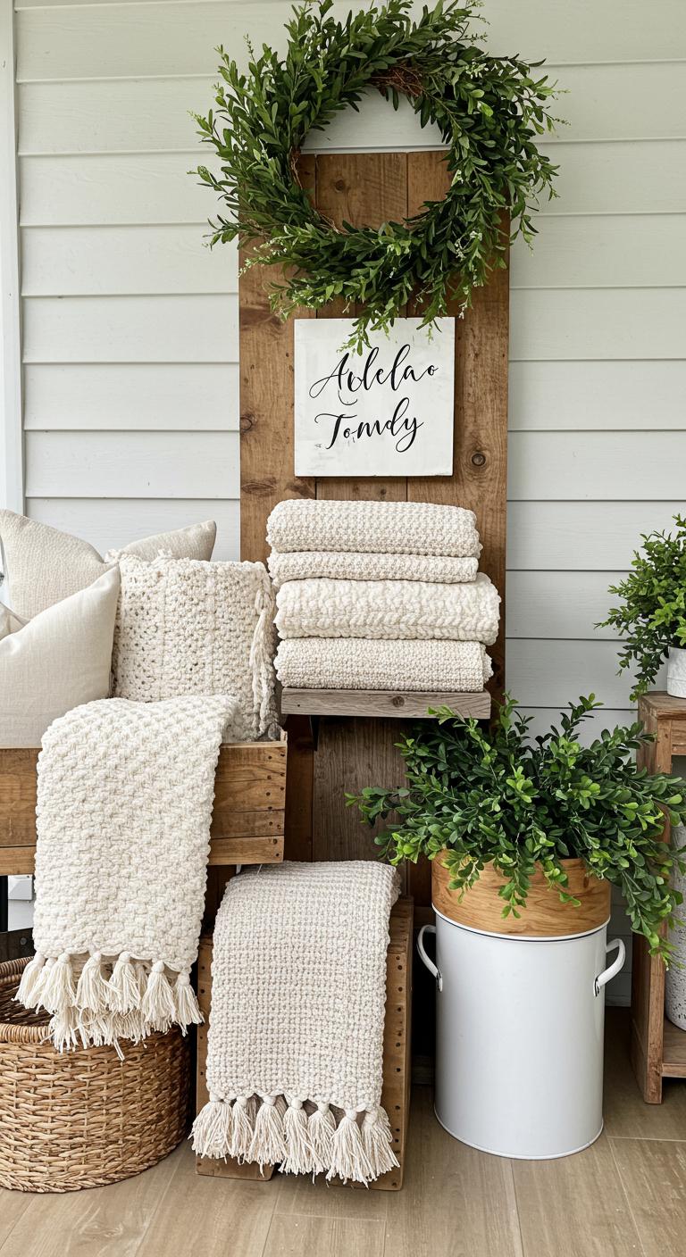 Textiles bring warmth and texture to your porch. Layer plaid throws and pillows over benches and chairs for a cozy nook. Choose sustainable materials like cotton or wool for a natural touch. You can easily find budget-friendly options at home goods stores or even make your own if you’re crafty. Mix colors and patterns for that eclectic farmhouse feel. Guests will be tempted to stay longer on your inviting porch.