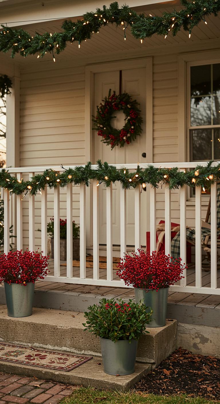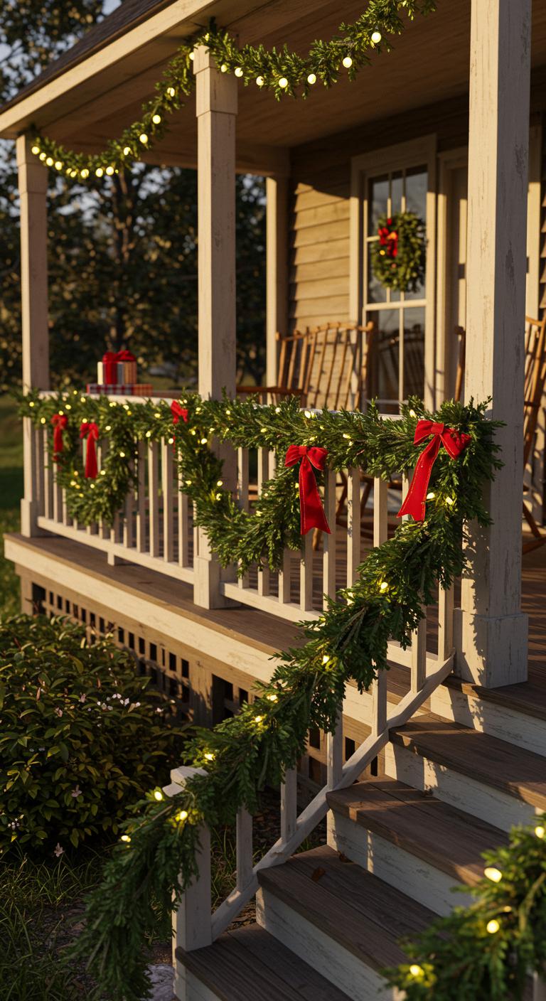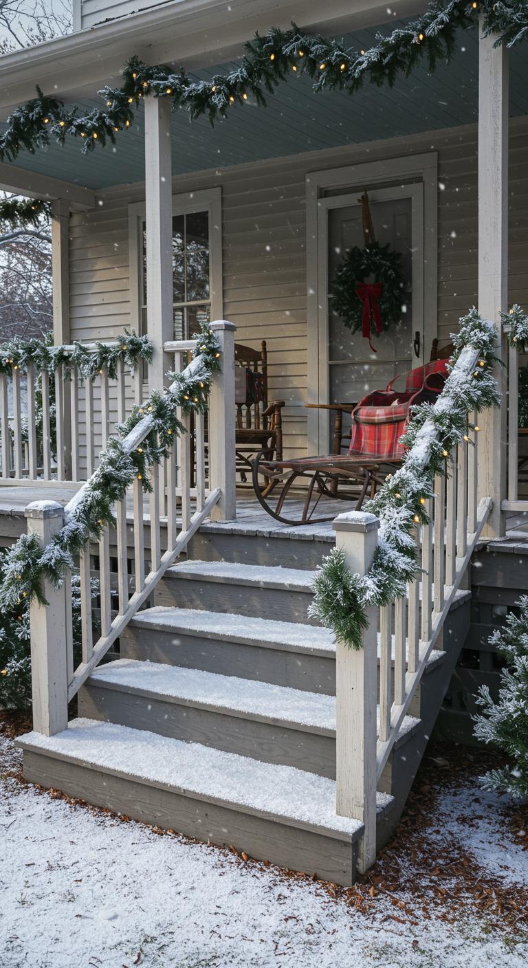 Incorporate natural greenery with garlands wrapped around railings or doors. Use fir, pine, or even eucalyptus for a fresh and fragrant touch. You can buy pre-made options or create your own by assembling cuttings and tying them together with twine. For a budget-friendly twist, collect branches from nearby trees. Add subtle decorations like berries or wooden ornaments for a festive flair. This adds a warm, inviting essence to any porch.