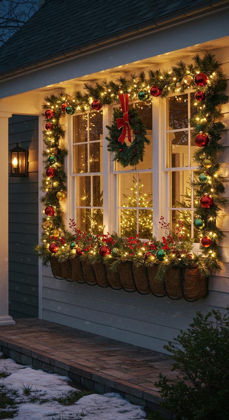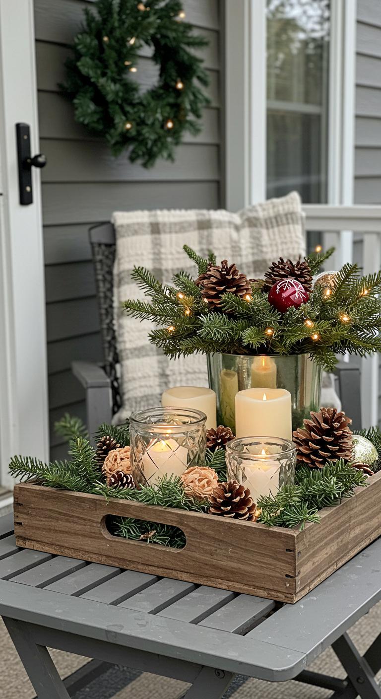 Emphasize an inviting look with decorated window boxes. Fill them with evergreen arrangements, ornaments, and twinkling lights to create a festive atmosphere. This approach extends your decor beyond the porch itself. If you don’t have a window box, you can use pots or repurpose wooden crates painted in festive colors. Personalizing the contents with family traditions or favorite colors can make these displays even more special.