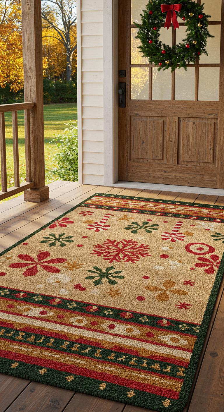 A festive outdoor rug can unify your porch decor. Look for colorful patterns that reflect the holiday spirit. It adds comfort and visual interest, encouraging guests to linger. Choose a weather-resistant option for durability. Opt for DIY by painting a simple rug with stencils for a personalized touch. Layering this with a larger neutral piece can also enhance your entry’s appeal.