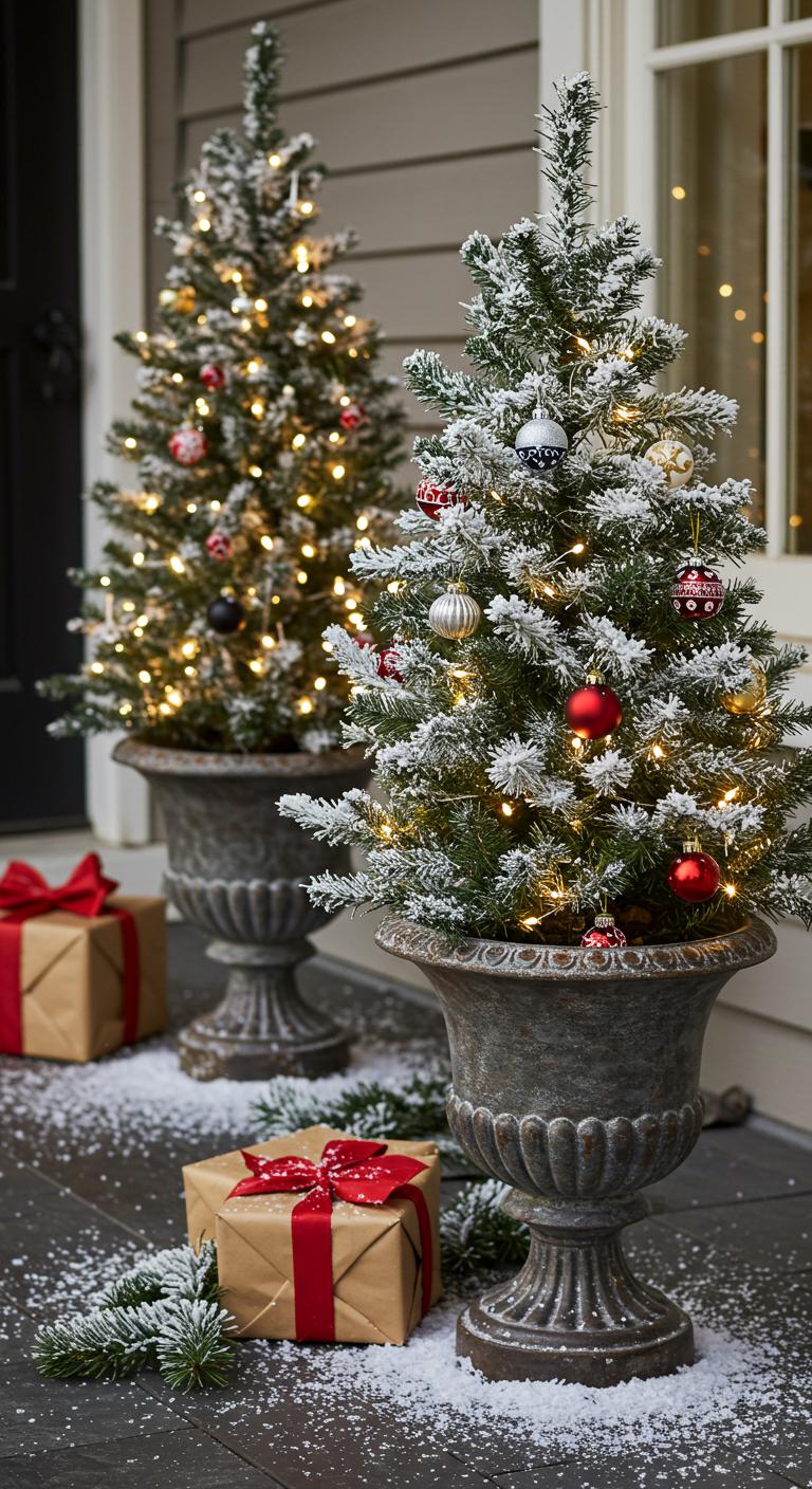 Mini Christmas trees are an excellent option for smaller porches. They add height and interest to your decor without overwhelming the space. Opt for rustic urns or baskets for a charming base. Dust them with faux snow for a winter wonderland effect. You can also let kids help decorate with handmade ornaments for a special touch. These trees can thrive indoors or outdoors, so make them a versatile part of your holiday decor.