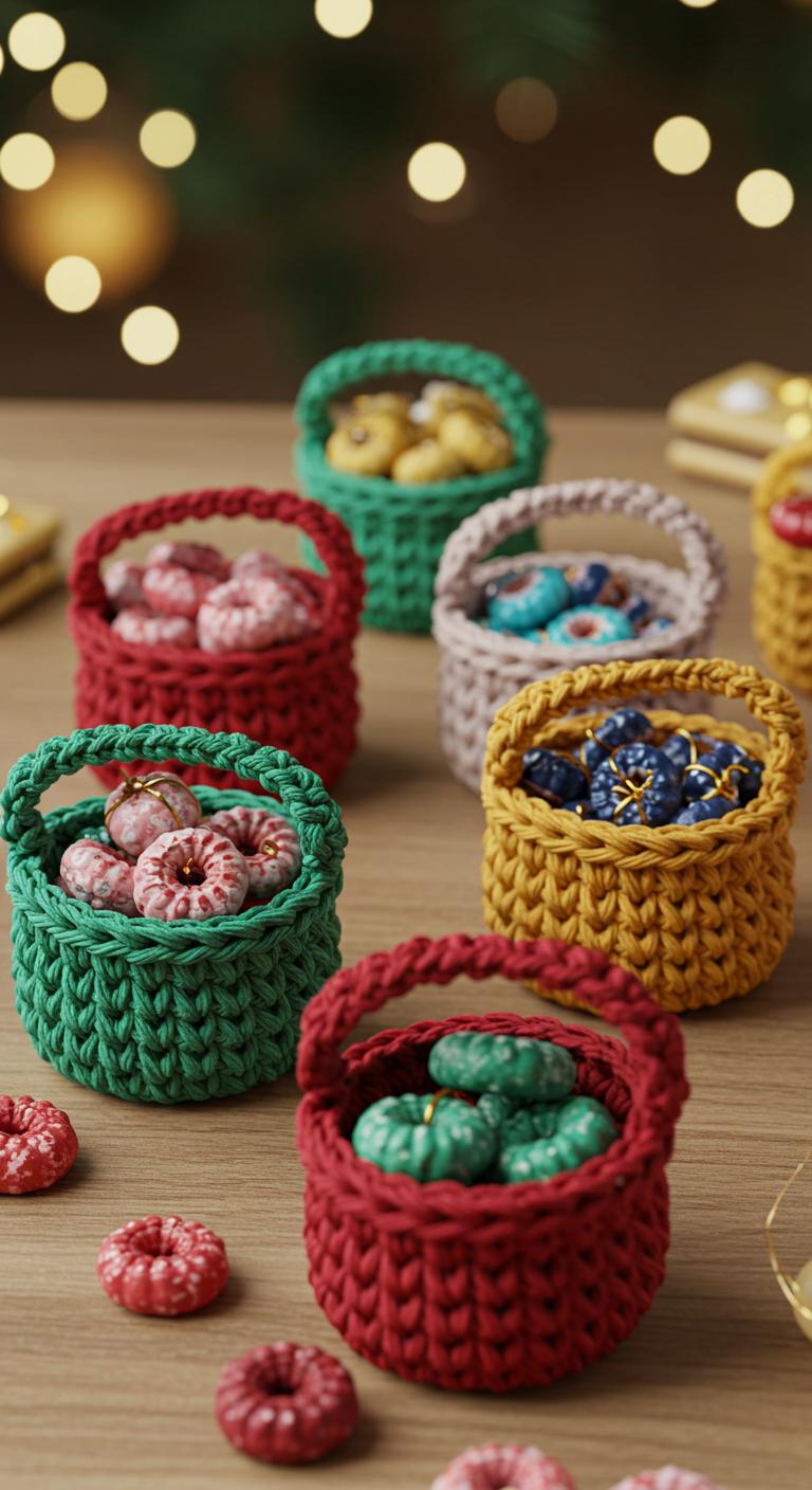 Make mini crochet baskets for holiday treats! They make wonderful gifts or decorative pieces for gatherings.