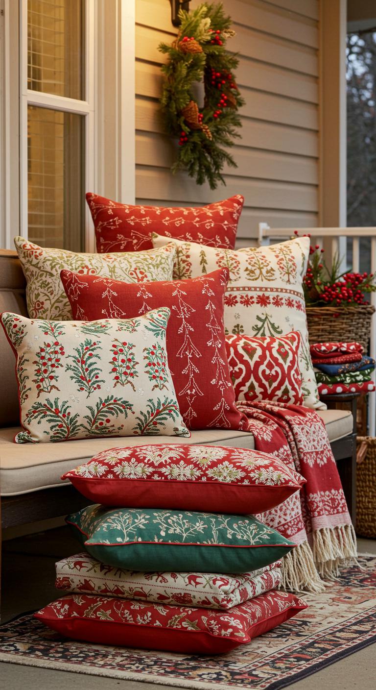 Comfort is key, so don’t forget about cozy textiles! Add festive pillows, warm blankets, and seasonal doormats to your porch seating area. Opt for waterproof options for durability against winter elements. Choose colors and patterns that blend seamlessly with your decor to create a harmonious look. This approach not only enhances visual appeal but also invites guests to relax and enjoy. Consider making DIY pillow covers with holiday fabrics for a personalized touch without breaking the bank!