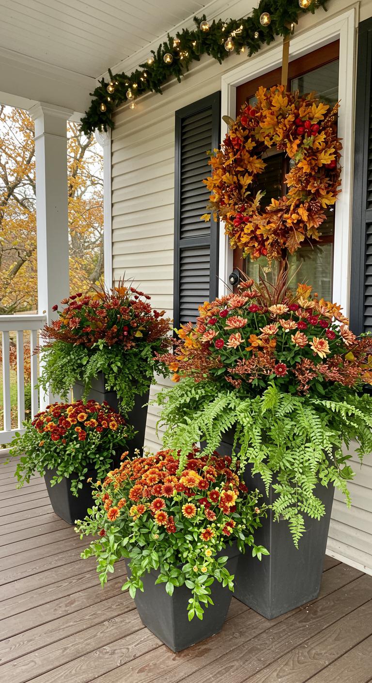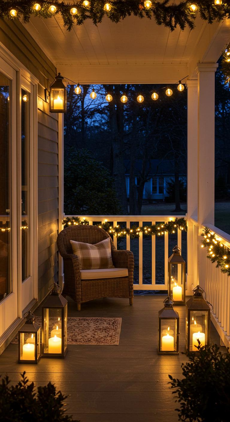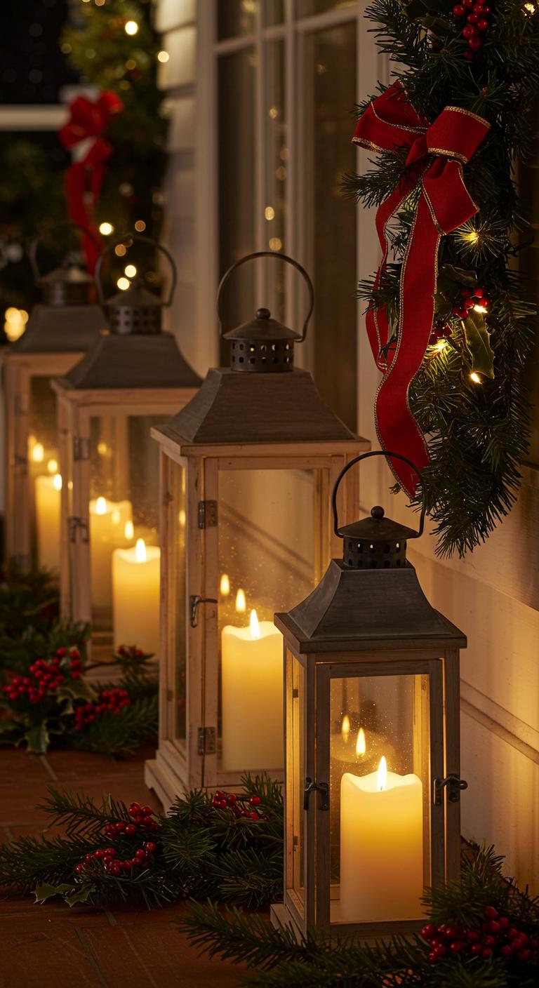 Create a soft ambiance with a combination of lanterns and candles. Lanterns add height and visual interest, while candles bring warmth to the setting. Opt for flameless candles for safety and longevity if children or pets are around. You can easily decorate the lanterns with seasonal blooms or greenery, enhancing their festive look. Place them strategically on steps or near seating areas to guide your guests. It’s a simple yet elegant way to provide inviting warmth as they arrive.