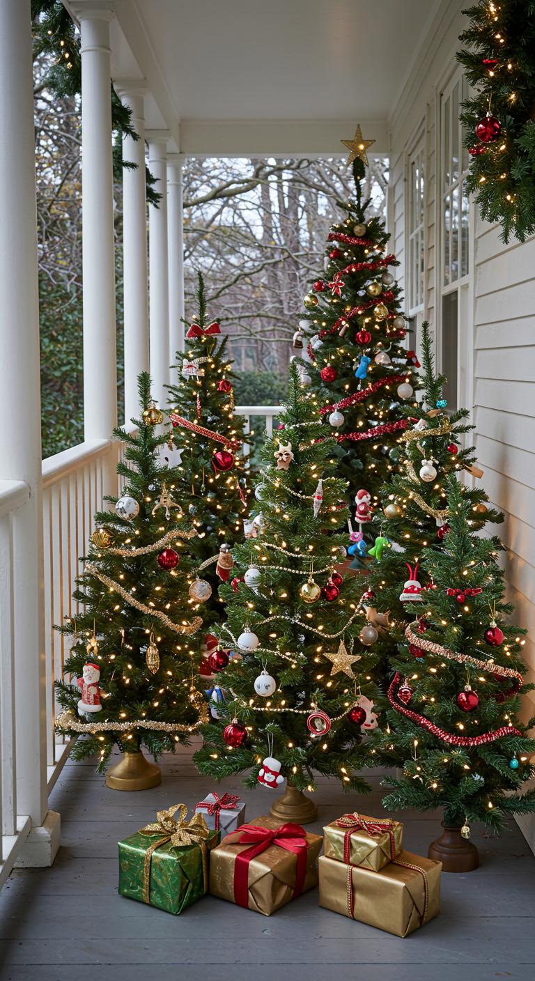 Small themed Christmas trees can make a big impact on your porch. Decorate each tree consistently for a cohesive look that ties your decor together. Consider setting trees on steps or in beautiful planters. Use different wrapping paper for bases or fun ornaments that fit your style. Simple DIY trees made from cardboard or painted pinecones can be a delightful weekend project. This fun approach allows you to express creativity while bringing joy and festivity to your home!