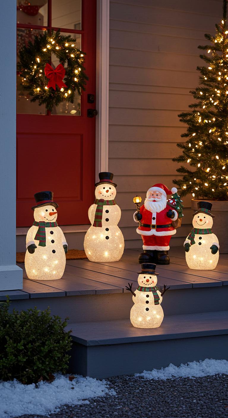 Add whimsical charm to your porch with weatherproof holiday villages or figurines. These decorations offer family-friendly fun and nostalgia. Choose themes that fit your personal style, like classic, modern, or even vintage characters. Place them on ledges or steps with ground lights to showcase them beautifully. Make a fun family project by collecting these pieces yearly, weaving personal memories into your decor. This approach adds a layer of joy and excitement for children and guests alike.