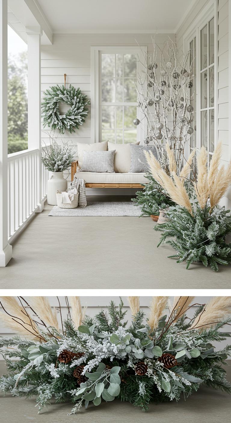 Design your porch for the season, not just the day. Use winter greenery and lights that can last beyond Christmas. Items like pine and mixed branches create a fresh look while remaining adaptable for New Year’s or winter gatherings. This approach offers flexibility for your decorating strategy, saving you time and effort. Shop for items in neutral tones that pair well with various colors, easily transitioning into other seasonal decor as needed!