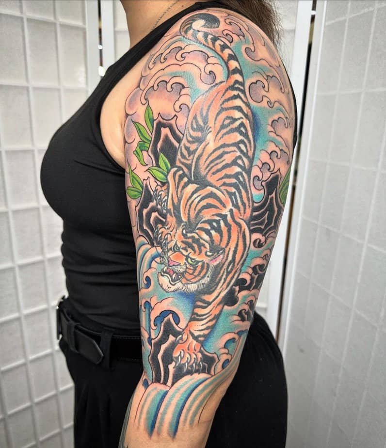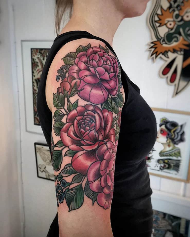 If you love color, this rose sleeve is for you. The pinks and greens are lush and vibrant, making the flowers feel alive. Roses are the classic symbol of love and beauty, and here they’re done with confidence and charm.