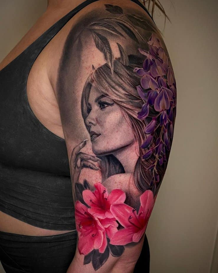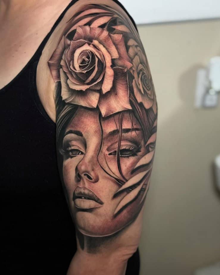 A portrait tattoo that doubles as art: soft shading, lifelike features, and roses woven into the piece make it feel both strong and tender. It’s a beautiful choice if you want something that whispers stories about identity and passion.