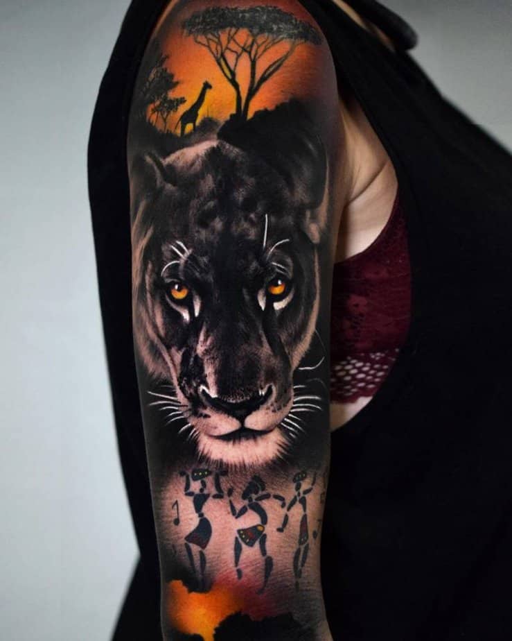 This piece hits you with raw strength — the lioness’s amber eyes pull you in immediately. Around her, there’s this whole little African sunset scene, giraffe silhouettes and acacia trees included, so it feels like a tiny movie on your arm. It’s bold but also full of grace.