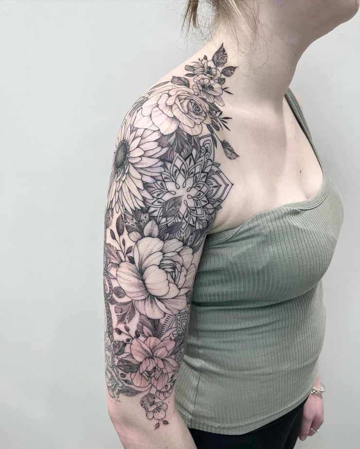 This one is a gorgeous mashup: mandala geometry bringing harmony and balance, softened by floral elements that warm it up. The black-and-grey shading is super detailed, so it feels meditative and bold at the same time — like a wearable little altar.