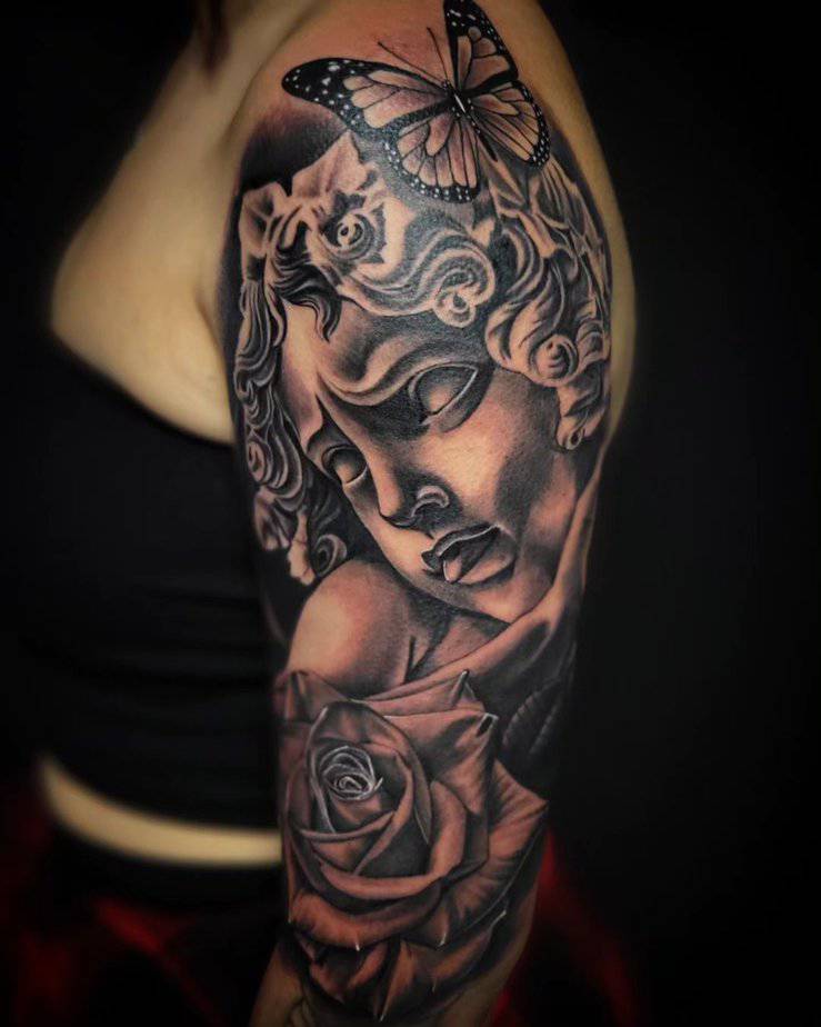 A serene goddess with flowing hair paired with a delicate butterfly — this sleeve reads like a story about growth and quiet power. It feels elegant and meaningful, a reminder of inner transformation wrapped in beauty.