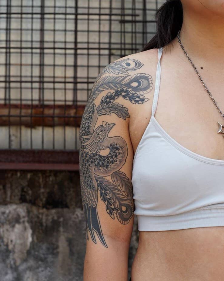 If you want something soft and feminine, this cherry blossom sleeve wraps around the shoulder like it was always meant to be there. The petals are shaded so delicately they almost look like they’re drifting in wind. Plus, the symbolism — beauty, renewal, life’s fleeting moments — gives it this quiet, meaningful energy.