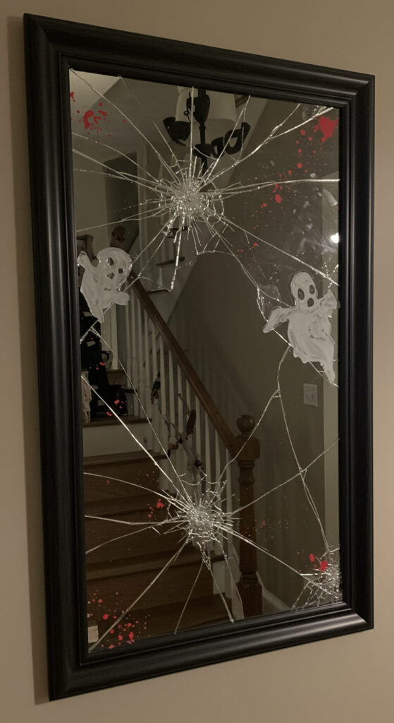 While the evening shadows lengthen, a haunted mirror adorned with faux cracks captures the essence of Halloween’s eerie charm.