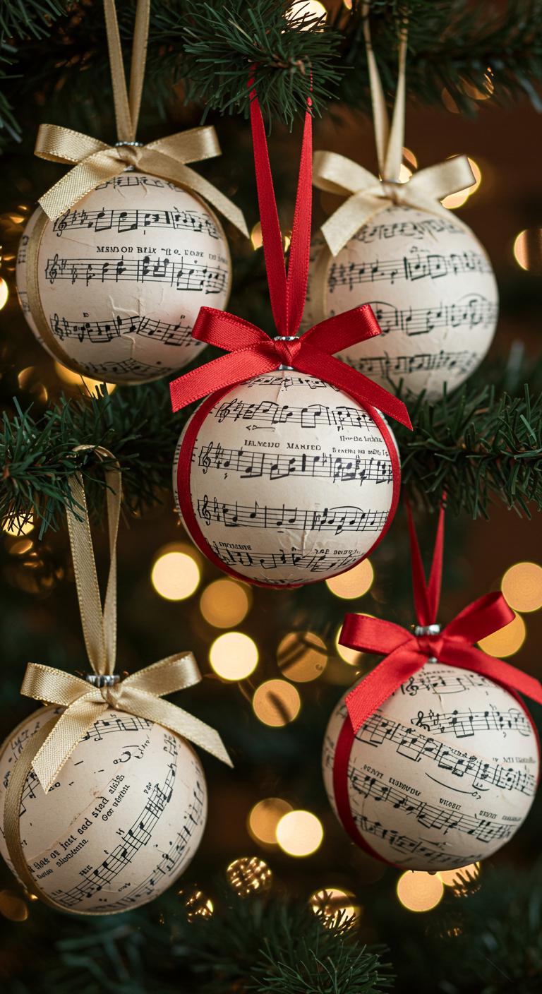 Vintage sheet music brings nostalgia to your tree. Use old sheet music to create layered or folded shapes. Cut into stars, circles, or even holiday-themed designs. Secure with ribbon to hang, and enjoy the musical essence they add. Budget Tip: Look for sheet music scraps at thrift stores or online!