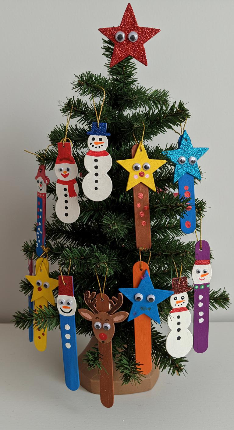 Popsicle stick ornaments are a fun, kid-friendly craft that’s perfect for families. Start by gluing sticks together to create shapes like snowflakes or stars. Then, let the kids paint and decorate them with glitter, sequins, and googly eyes. These ornaments provide endless creative possibilities! Tip: Use an old wooden crate to store your supplies and keep everything organized during your crafting sessions.