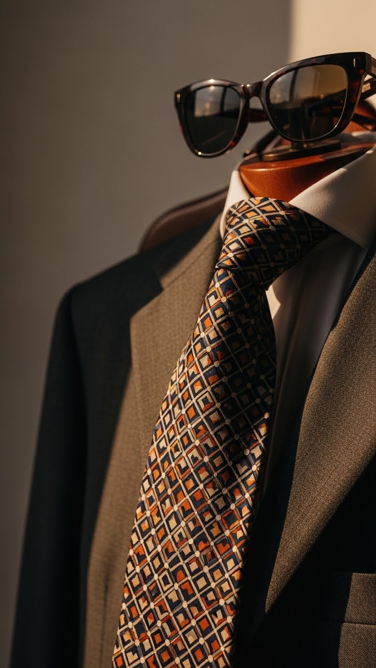 After the sculptural sunglasses have set the tone, a silk tie finishes the outfit with equal intention. You’ll choose an Hermès Mosaic tie for its Hermès craftsmanship and confident patterning; silk weaving yields a weighty drape and luminous color.