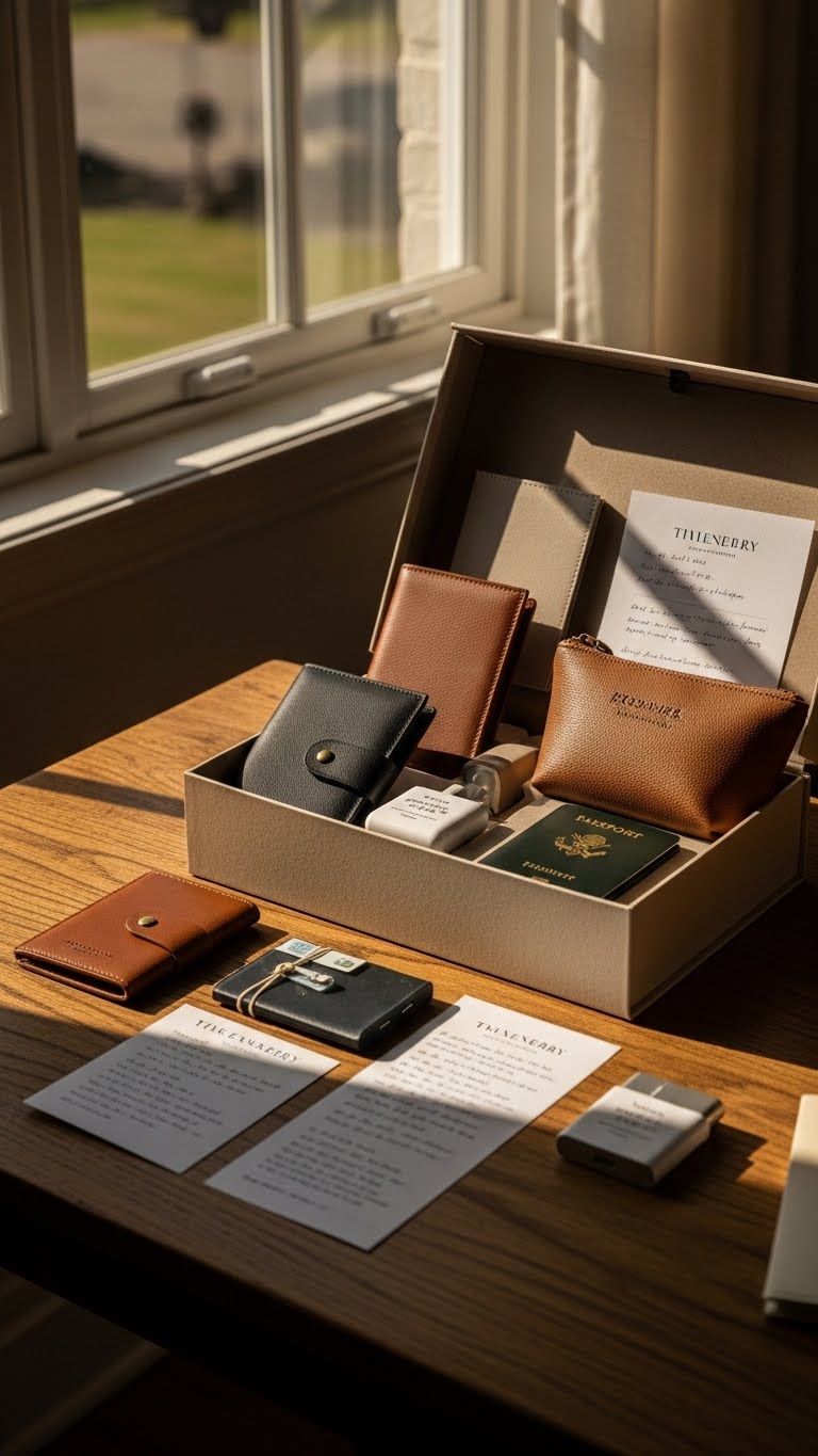 You’ll choose bespoke toiletry pouches, compact leather organizers, passport cases, and printed curated itineraries that inspire spontaneous escapes—each box designed to free him from friction and elevate every journey.
