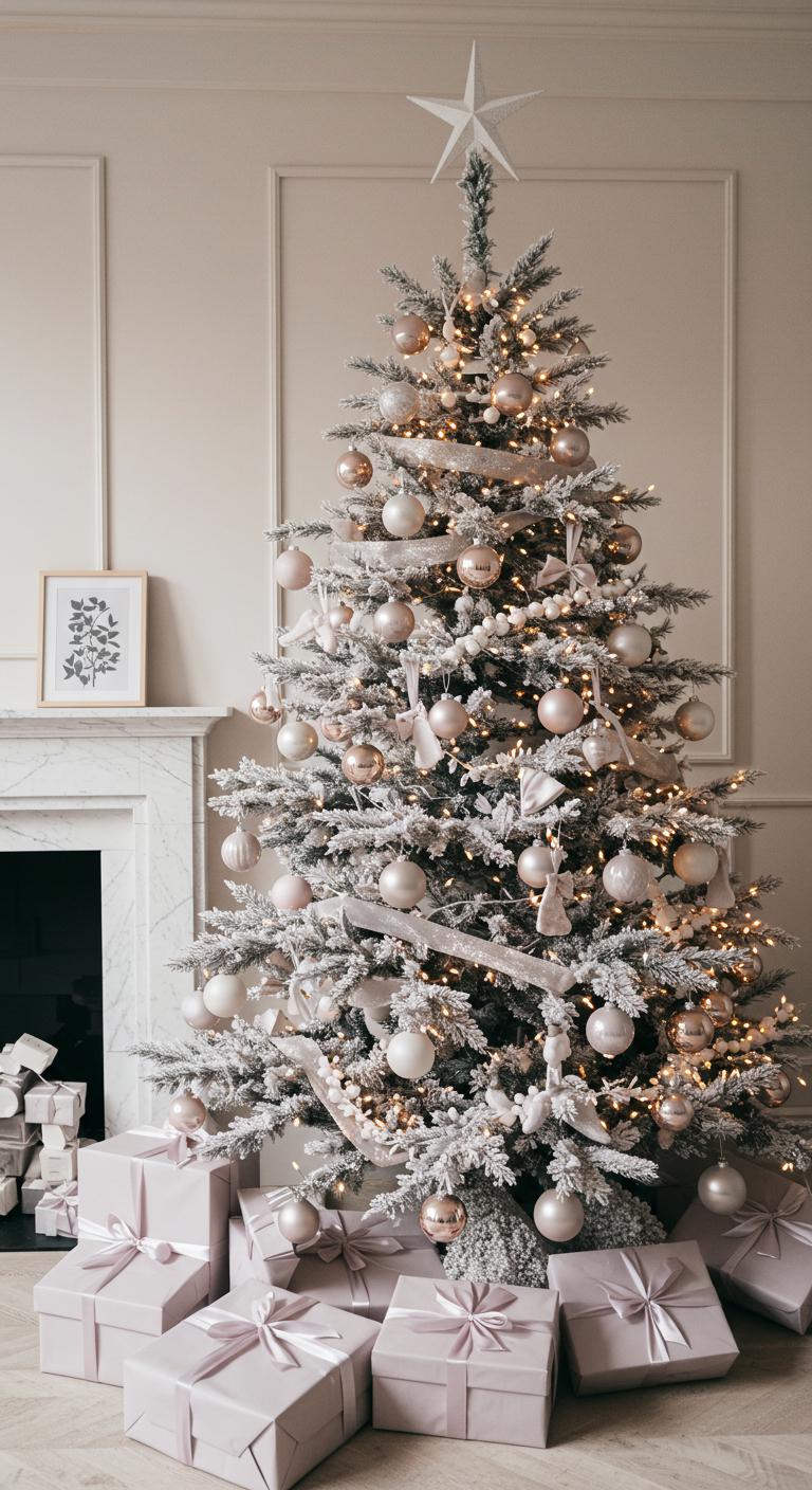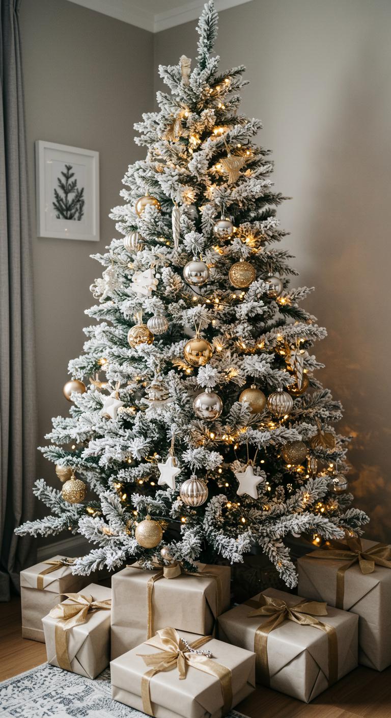 Flocking your tree gives it a soft, snow-kissed appearance. Choose a few understated ornaments in warm tones like gold or plum. This keeps the design refined yet visually interesting. Hang some natural elements like pinecones or dried orange slices to add texture. To achieve this look affordably, purchase a pre-flocked tree or DIY by spraying artificial snow on a green tree.