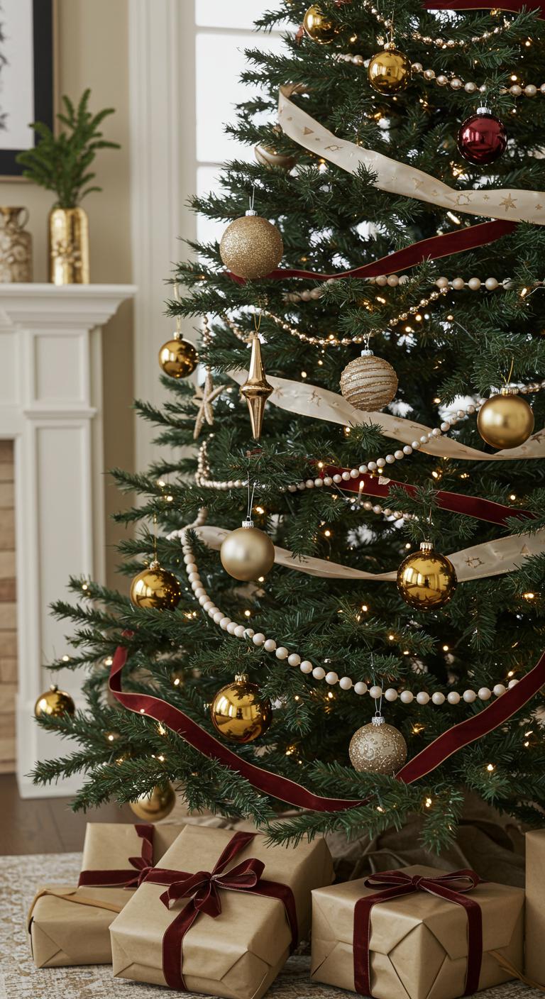 Choose one color, like all-white or all-gold, for a harmonious feel. This design embraces the minimalist allure and provides visual clarity. When decorating, stick to different textures or materials—such as matte and glossy finishes—within the color scheme. To save money, use ornaments gathered over the years that align with your chosen color.