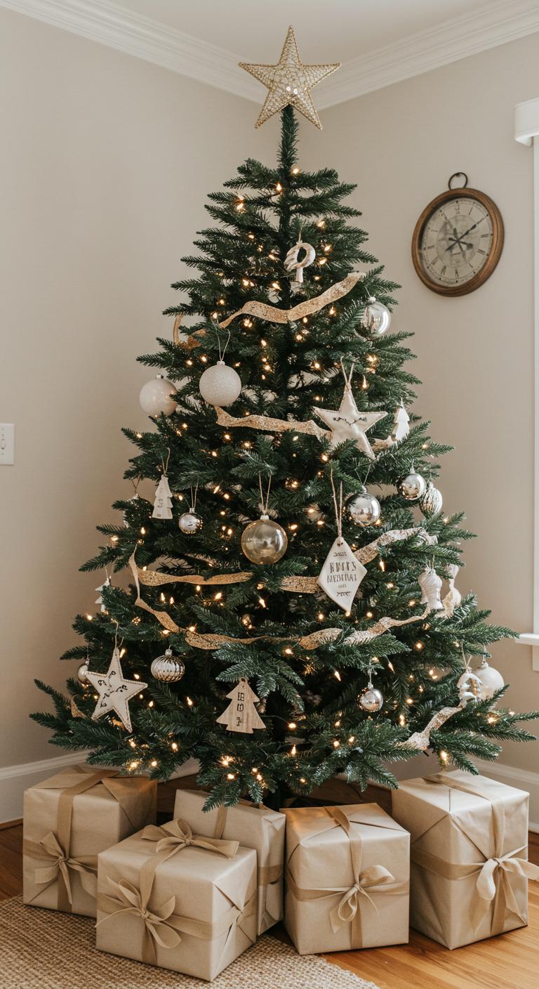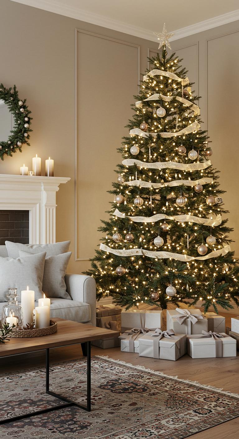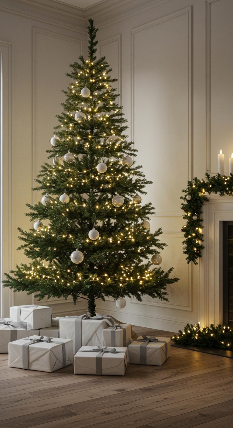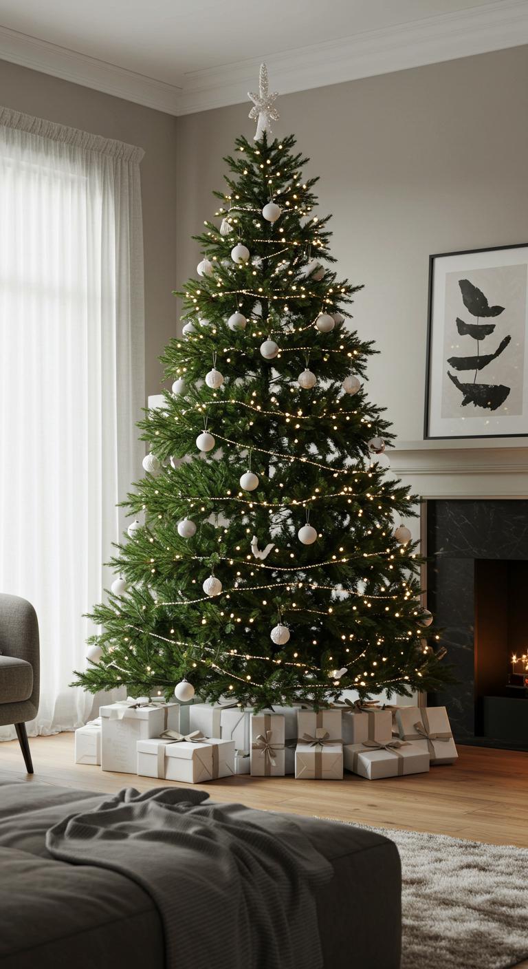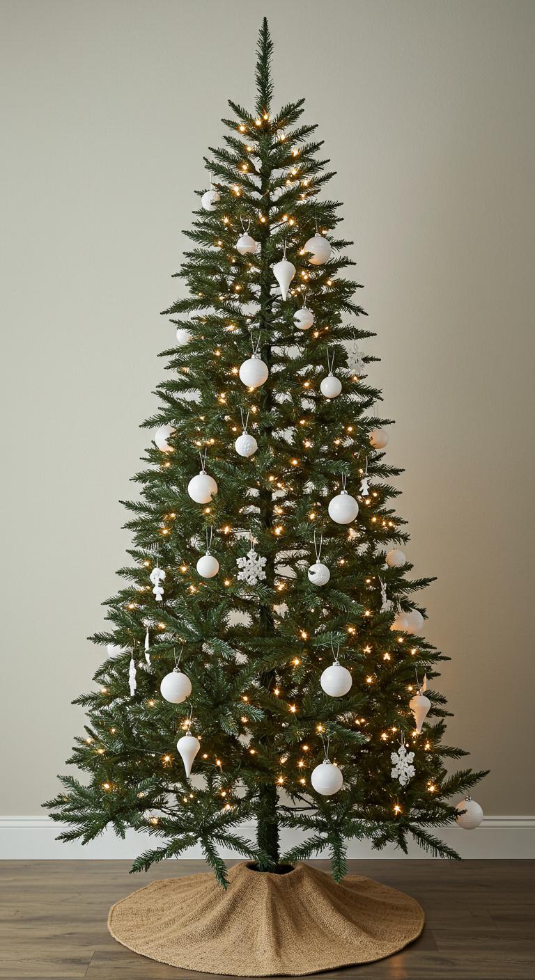 A slim silhouette tree is perfect for smaller spaces. Its design allows you to embrace minimalist elegance without compromising on style. Choose an artificial tree with a clean finish in neutral tones. Instead of heavy decorations, use uniform white ornaments. This keeps the look cohesive and airy. You could even create your own ornaments with white-painted wood or paper. For a budget-friendly skirt, consider a simple burlap fabric that adds texture without overwhelming the design.