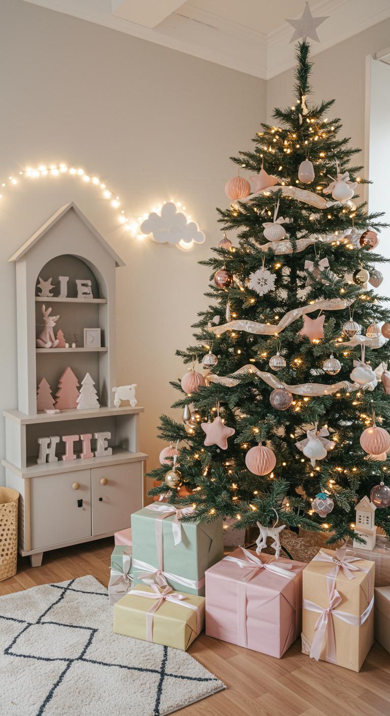 A minimal garland-free look makes a huge impact. Instead of the usual garlands, allow your tree to shine on its own. You can achieve this by carefully selecting a few standout ornaments or relying solely on twinkling lights. This approach keeps things clean and visually appealing while highlighting the tree’s natural beauty. To keep it interesting, experiment with different textures at different levels. You maintain a minimalist vibe without losing charm and elegance.