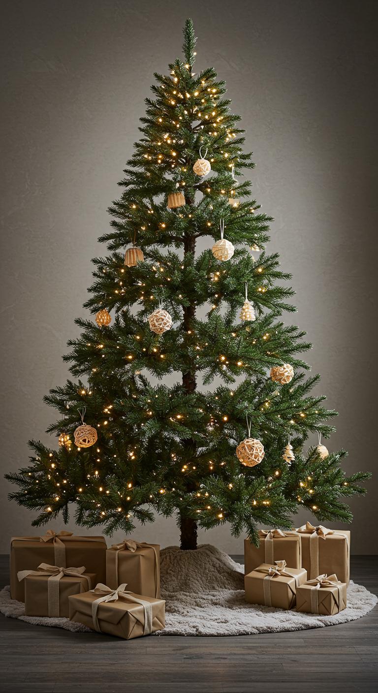 Using lighting as the focal point transforms a minimalist tree into a magical centerpiece. Instead of decorating with multiple ornaments, consider limiting your design to warm LED lights. Wrap the lights gently around the branches, allowing them to sparkle and create ambiance. Keep it simple and elegant by associating glowing elements with natural textures, like a warm beige tree skirt from linen. For an affordable option, repurpose string lights from previous holidays or shop for budget-friendly sets online.