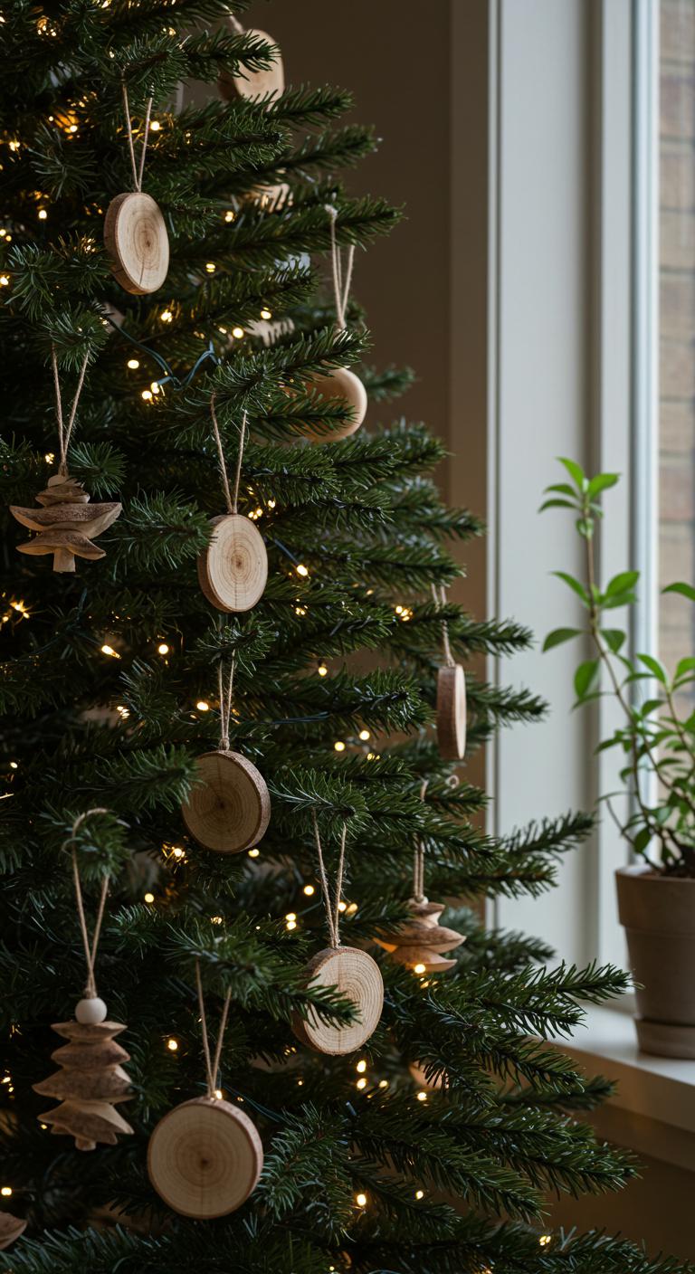 Incorporating natural wood accents into your tree design offers rustic charm. Wooden ornaments add an organic touch to the overall aesthetic. You can find pre-made options, or get crafty by shaping your own from slices of untreated wood. A light stain or sealant protects the surface, letting you personalize with paints or burn designs. This enhances the natural beauty while remaining eco-conscious. Pairing them with soft fabric ribbons or simple burlap creates a warm yet minimal feel.