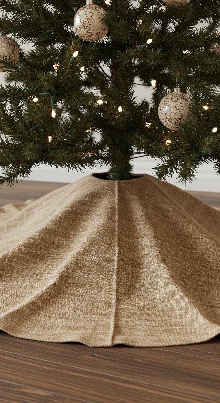A simple textured skirt rounds off a minimalist Christmas tree. Opt for materials like burlap or muslin to align with your clean aesthetic. These fabrics add character and warmth without overtaking the design. Creating your own tree skirt is also an affordable project. Simply cut fabric into a circular shape and let the edges fray for an effortless vibe. You can also add embellishments like twine or a simple embroidered pattern to personalize it.