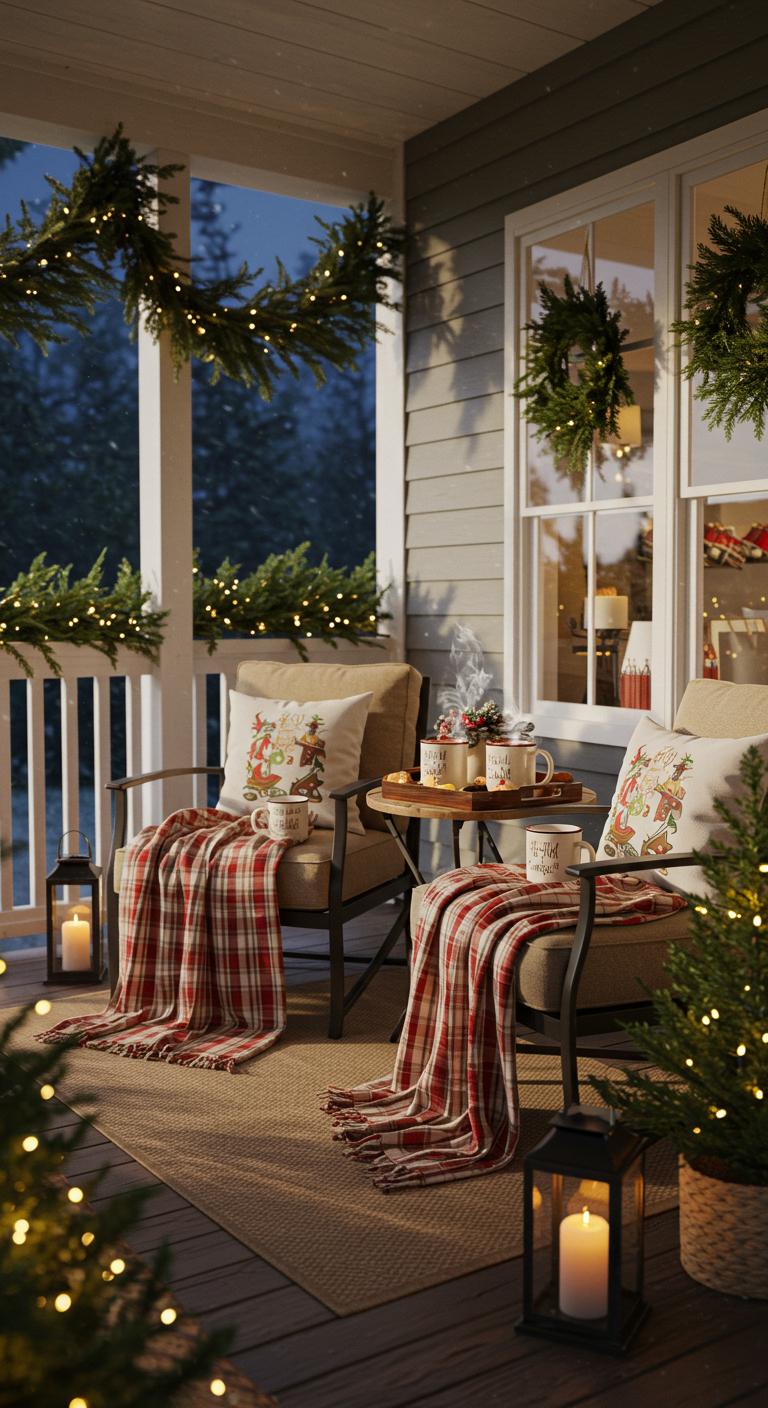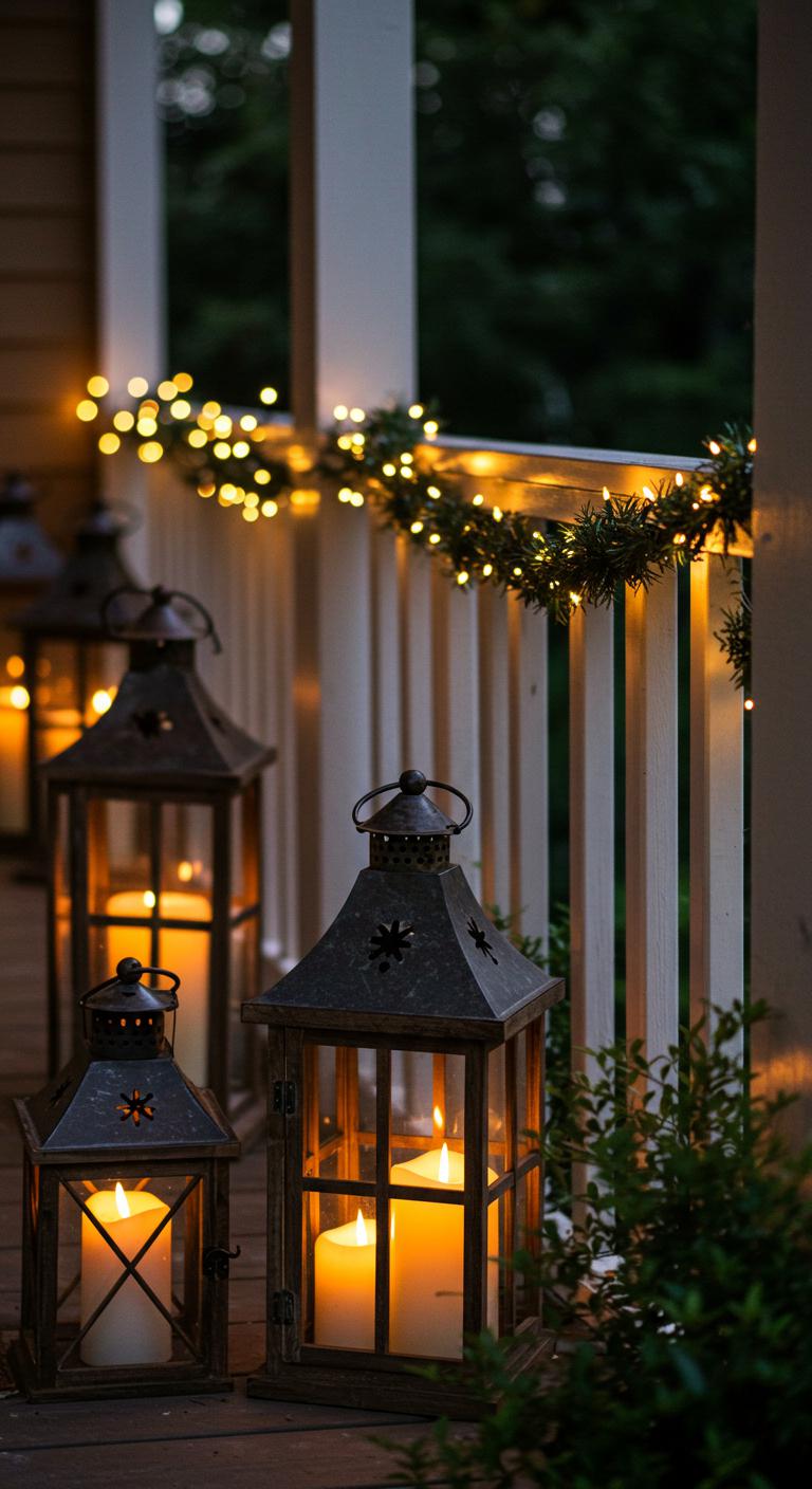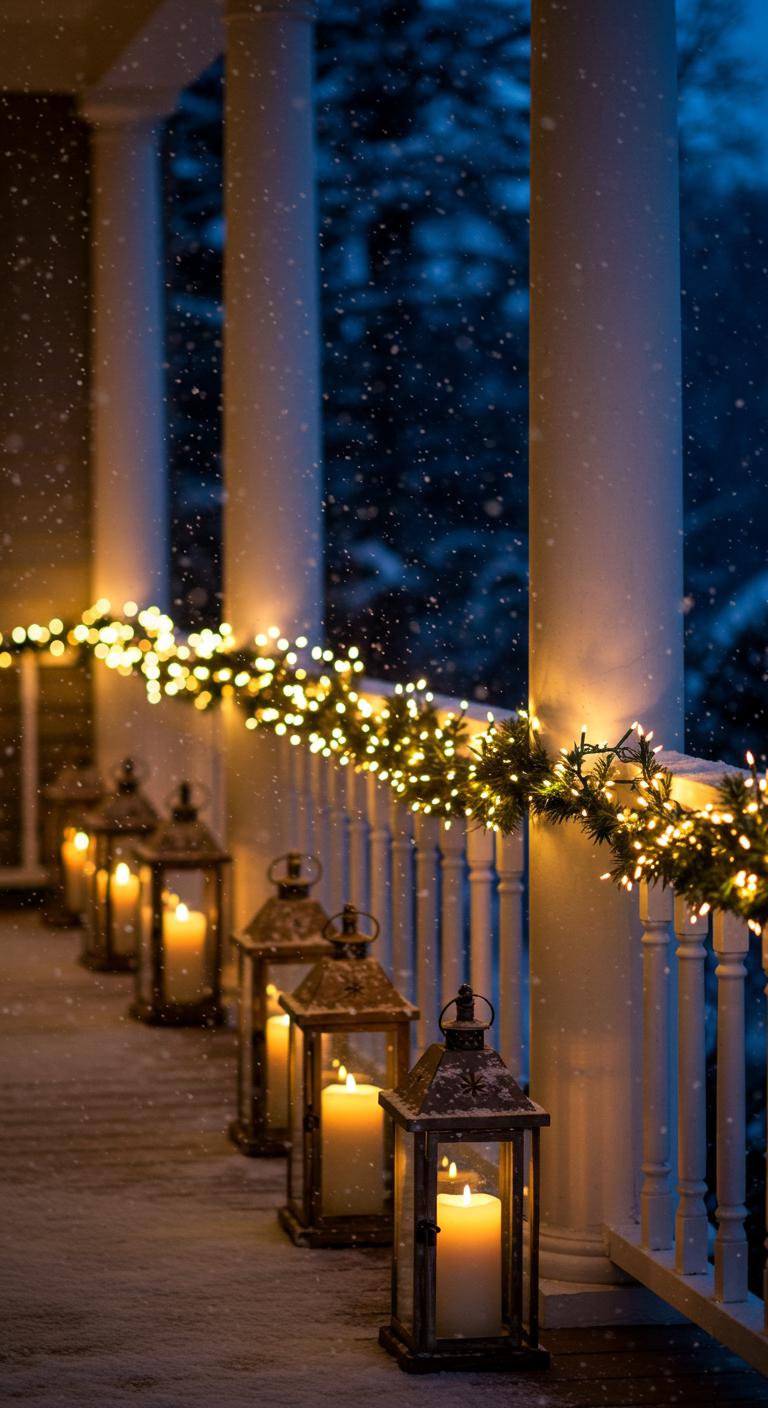 Twinkling lights can transform a porch into a winter wonderland. Consider using warm white lights for a classic look, or opt for multi-colored for something nostalgic. To save on costs, shop post-holiday sales for lights. Wrap them around railings and add them to trees or shrubs nearby. Battery-operated options are available for smaller spaces. Place lanterns with candles or solar-powered lights nearby to enhance the magical feel at night.
