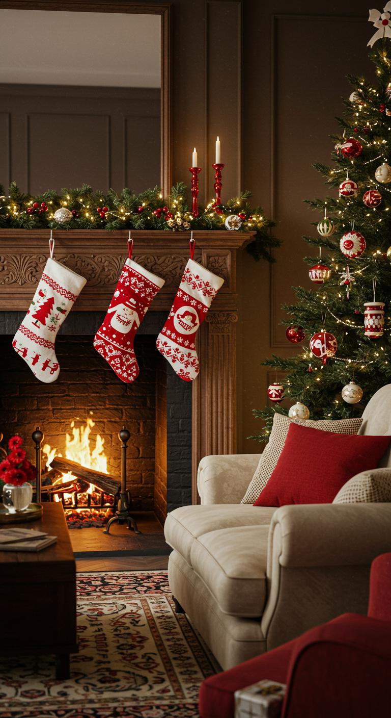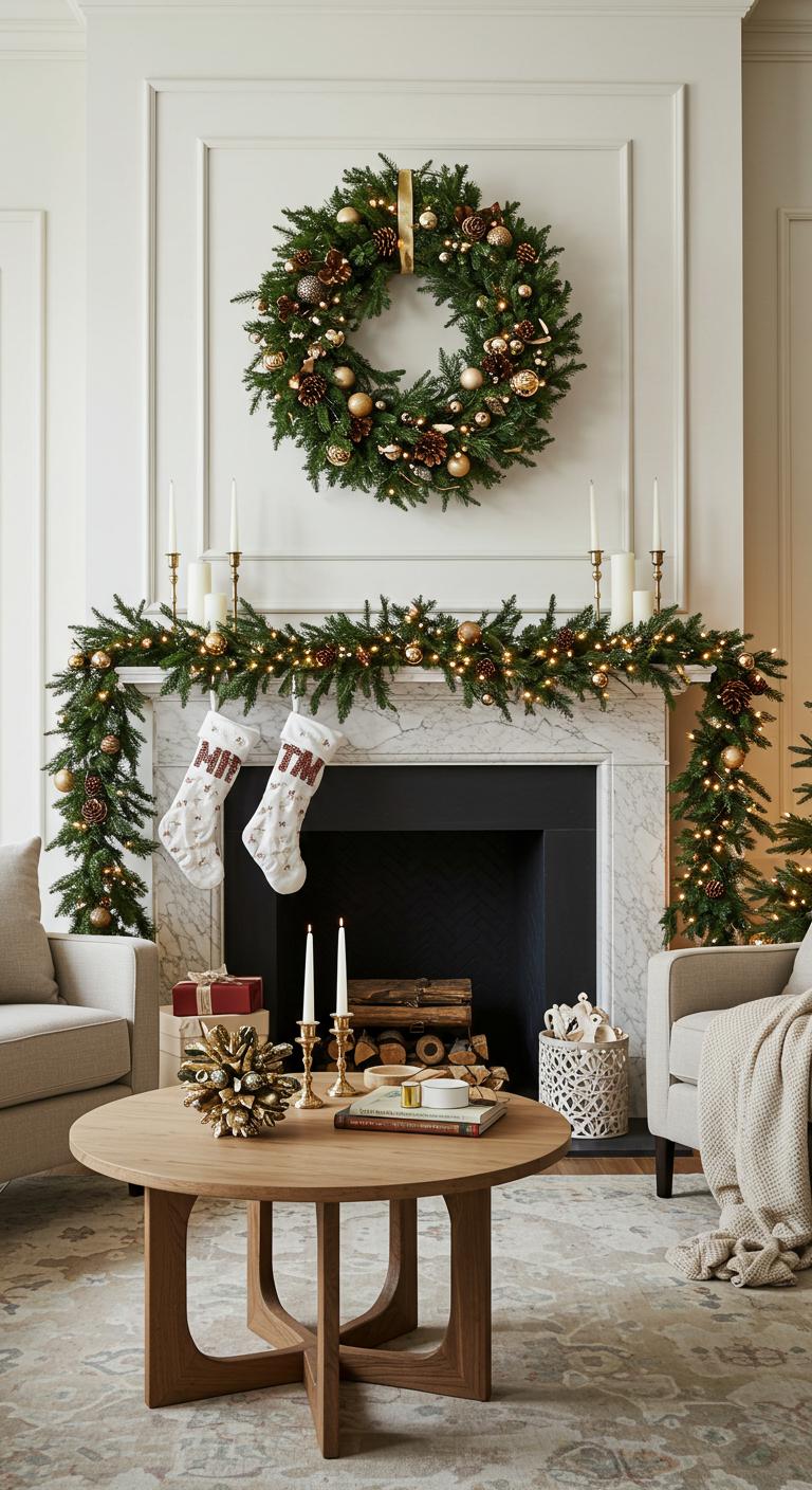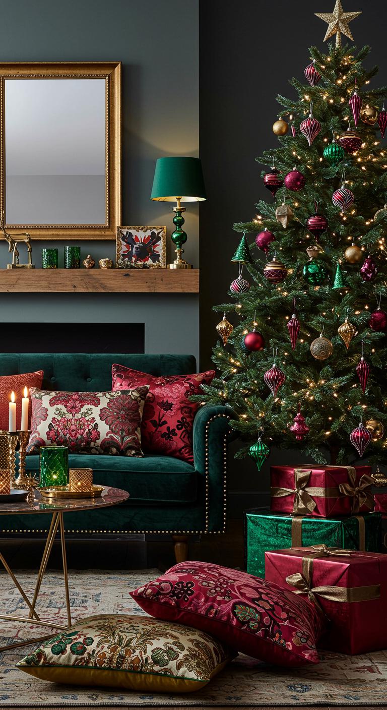 Embrace the multi-dimensional decor trend by layering elements within your living room. This creates visual interest and depth. Use a variety of items, such as garlands draped over stockings or mixing shiny and matte ornaments on the tree. Adding varying heights in decor draws the eye and enhances the festive atmosphere. Stack packages of different sizes on your coffee table, and display ornaments in clusters. Each layer invites more enchantment into your space, embodying the holiday spirit.