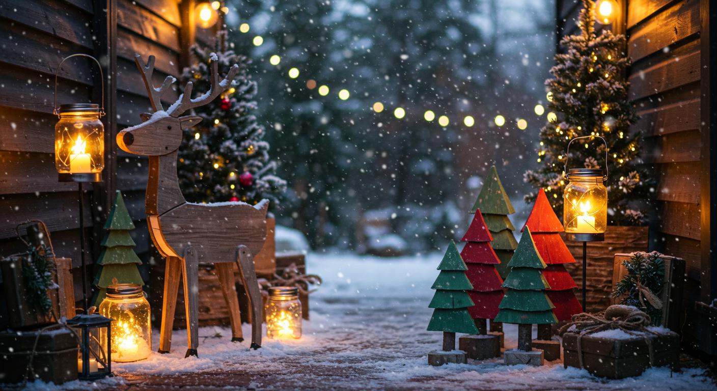 Creating a DIY wooden reindeer is a fun and rewarding project that adds a charming touch to your outdoor holiday decor. Start by gathering materials like plywood, screws, and wood glue. Cut out the reindeer shape, then assemble the pieces securely. Once your reindeer is assembled, it's time for some wooden reindeer painting! Choose festive colors like red, white, or a rustic brown to give it that cozy feel. Don't forget to add rustic reindeer accessories, like a burlap bow or a little bell, to enhance its charm. Finally, place your reindeer in your yard, and watch as it spreads holiday cheer to your neighbors and guests. This delightful decoration is sure to become a seasonal favorite!