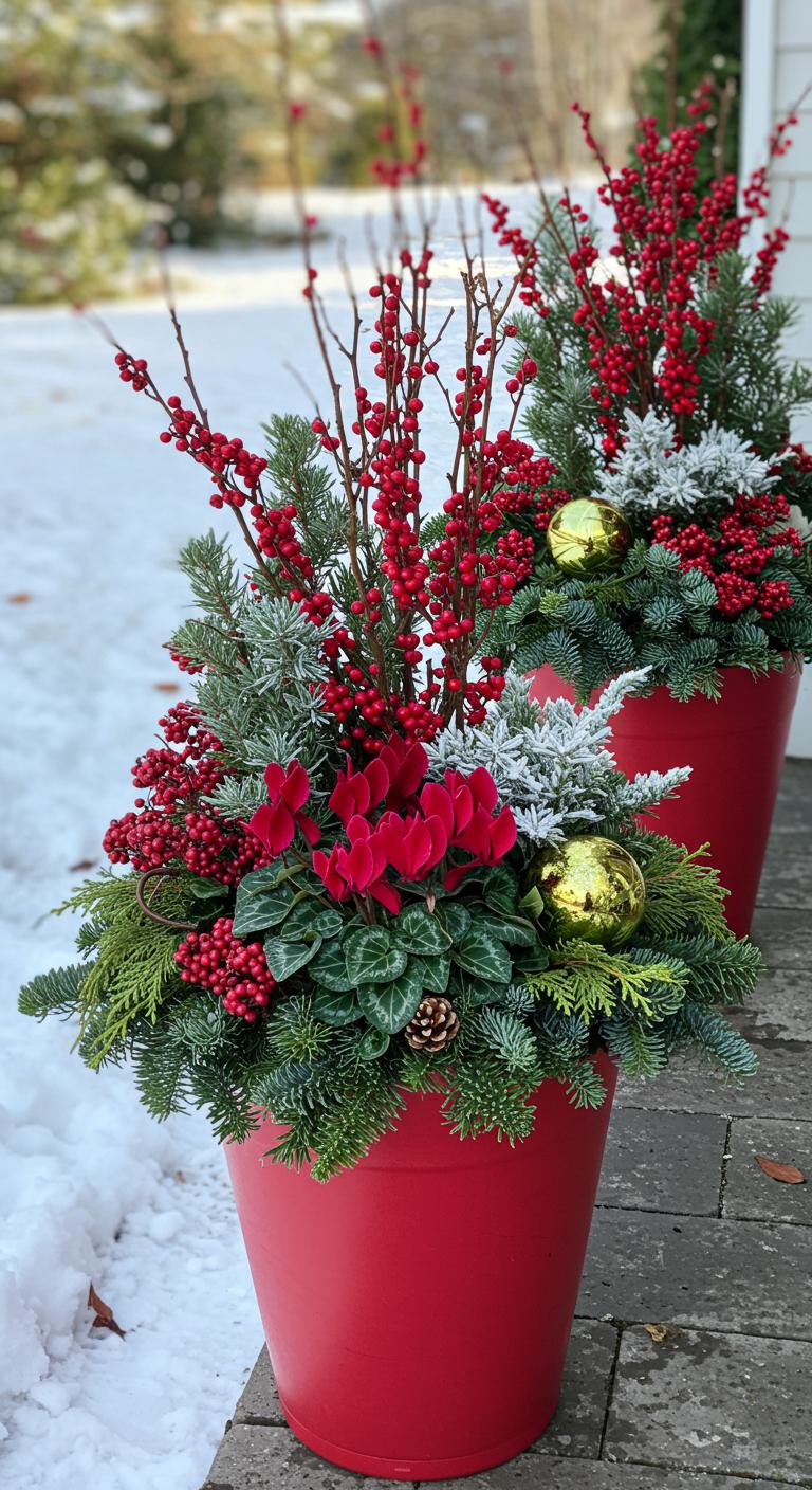 Decorate your outdoor planters with holiday cheer. Use winter plants such as evergreens or poinsettias. Add ornaments, ribbons, and lights for flair. This is a simple way to introduce color into your winter outdoor space.