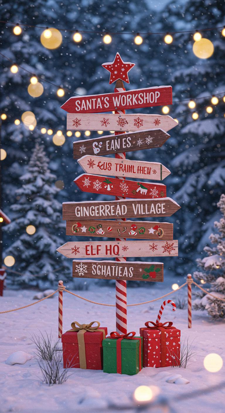 Create festive sign posts with old wood or pallets. Paint signs with fun holiday phrases or directions to “Santa’s Workshop.” These quirky decorations spark joy and add a playful touch.