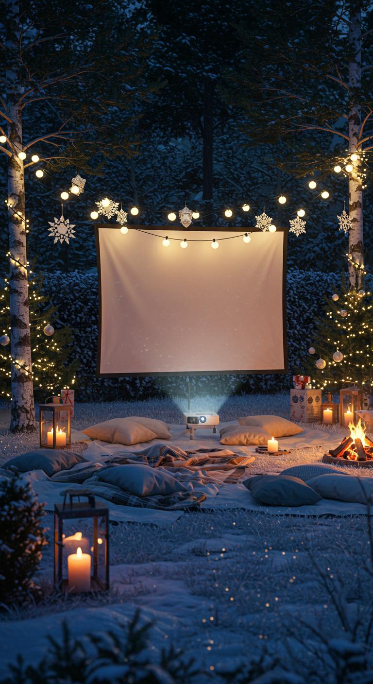 Set up an outdoor movie night with holiday films. Use blankets and cushions for comfort. Hang string lights for a cozy ambience.