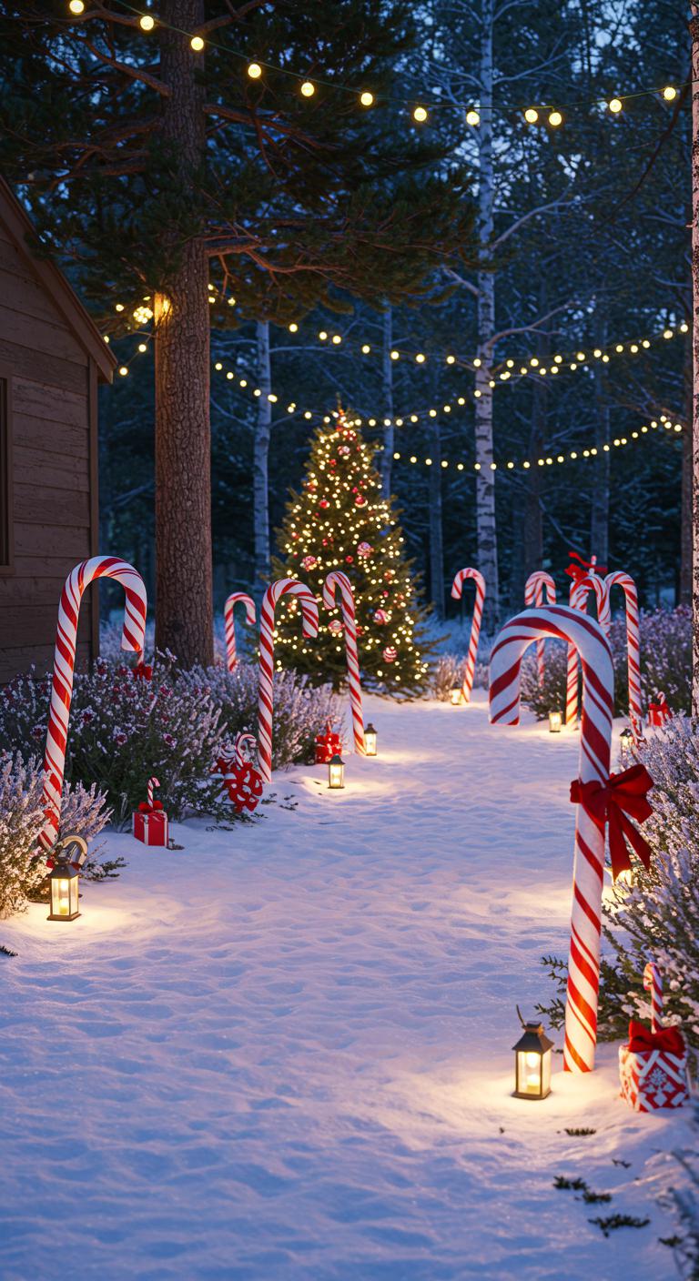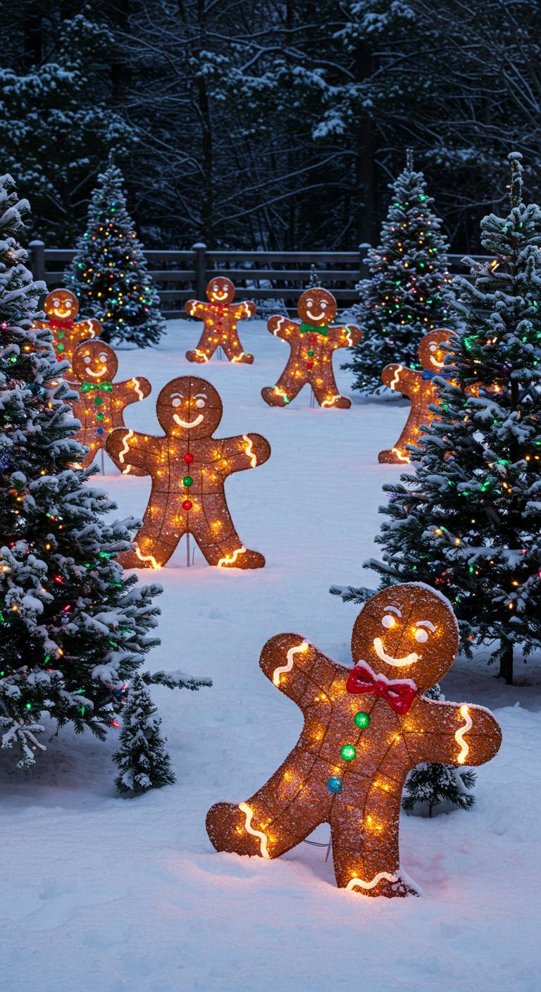 Make light-up gingerbread men from plywood or foam board. Paint them brown and place warm lights behind. This playful decoration adds whimsy to your garden.