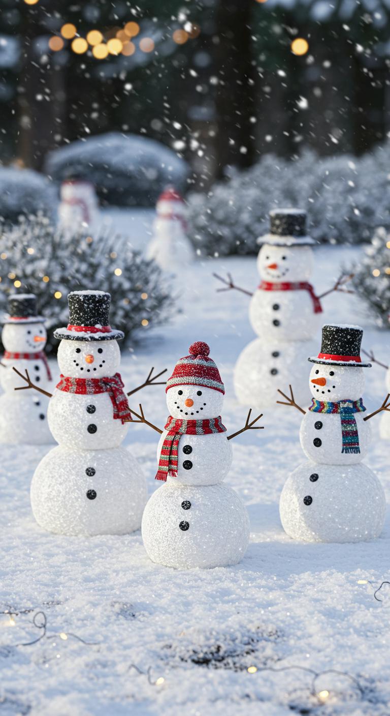 Create friendly snowman decorations using white painted pots or stacked items. Dress them up with scarves and hats, and place them on porches or in gardens.