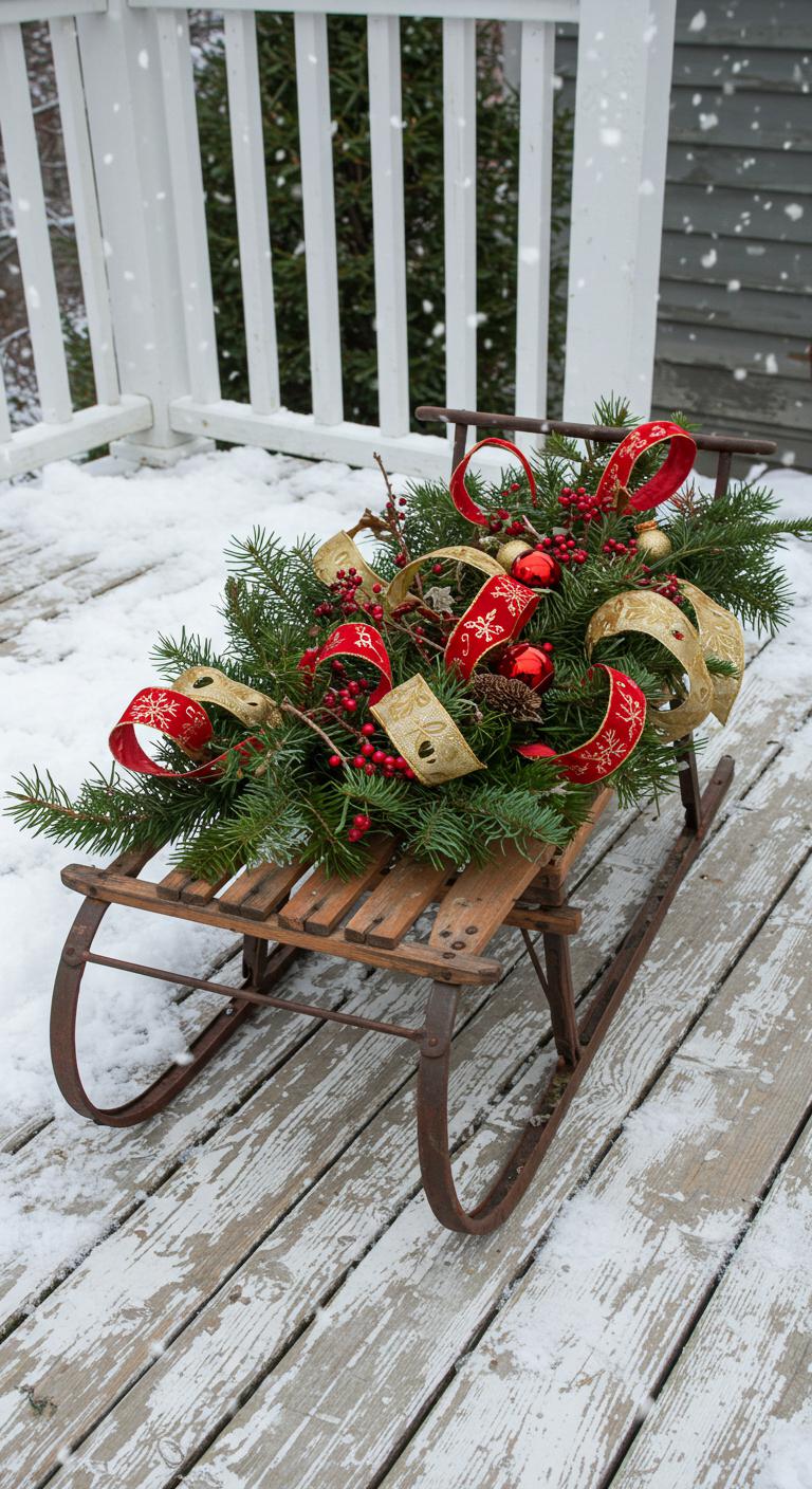 Give old sleds a new life this Christmas. Prop them against a wall or lean them on a tree, adorned with garlands, or even a small Christmas tree on top. Decorate with red and green ribbons for a classic touch. This project adds charm to your porch while using materials that might otherwise go unnoticed.