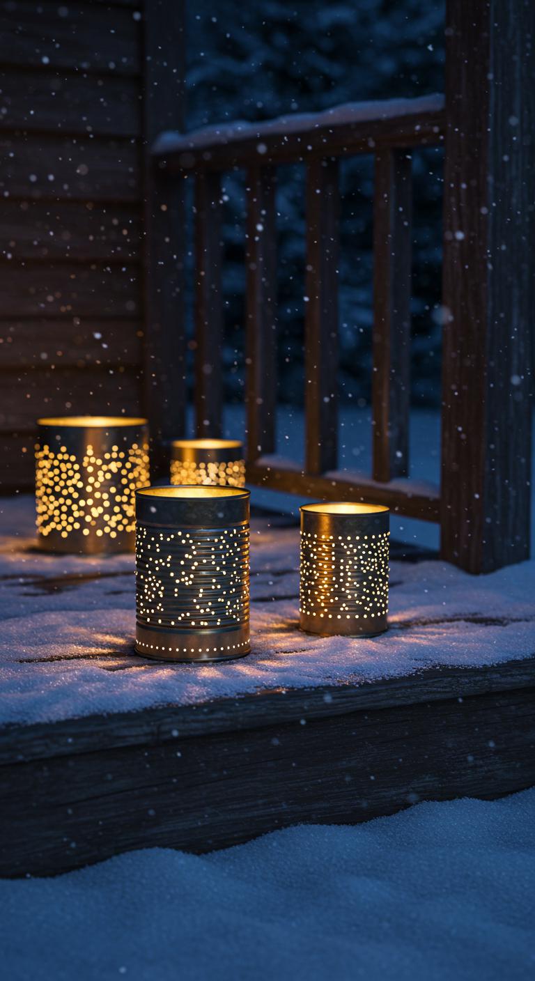 Transform tin cans into lanterns for a unique outdoor display. Fill them with water and freeze overnight. Once frozen, remove the ice and puncture designs into the cans. Fill with tealights and place them in your garden or along paths. This project is both creative and budget-friendly, ensuring you put old cans to good use.