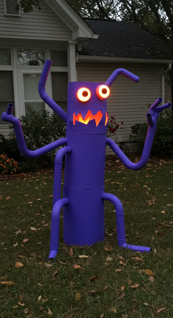 Adorned with glowing pipe eyes, the monster features an imaginative blend of whimsical pipe shapes that evoke joy rather than fear. Perfect for festive pipe arrangements, this outdoor PVC decor serves as delightful Halloween pipe crafts, offering families a fun project that brightens the season.
