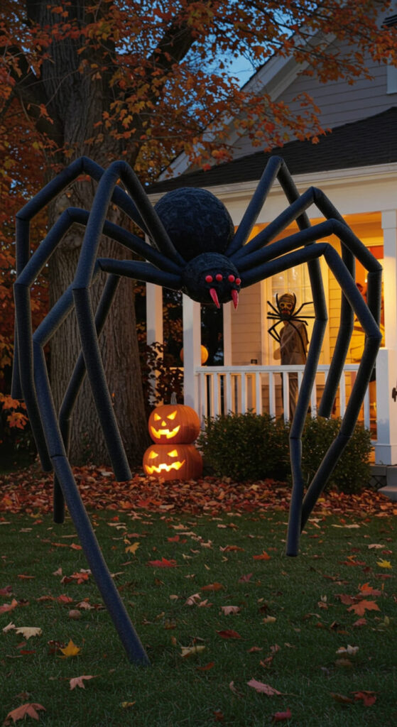 Giant spider decorations bring an exhilarating sense of fright to Halloween displays, enchanting the attention of passersby with their imposing presence. Designed using black pool noodles for elongated spider legs, these creations can mimic spider anatomy to enhance realism. Draped from porches or nestled among trees, they evoke spider symbolism, representing both fear and mystery. For added impact, creators can use covered Styrofoam balls as bodies, allowing for a striking contrast against the dark backdrop of autumn nights. Overall, these decorations redefine outdoor Halloween aesthetics, transforming mundane spaces into thrilling environments that capture the spirit of the season.
