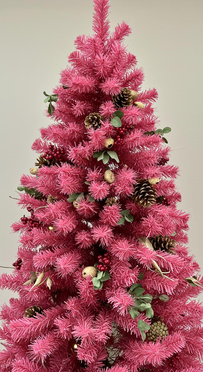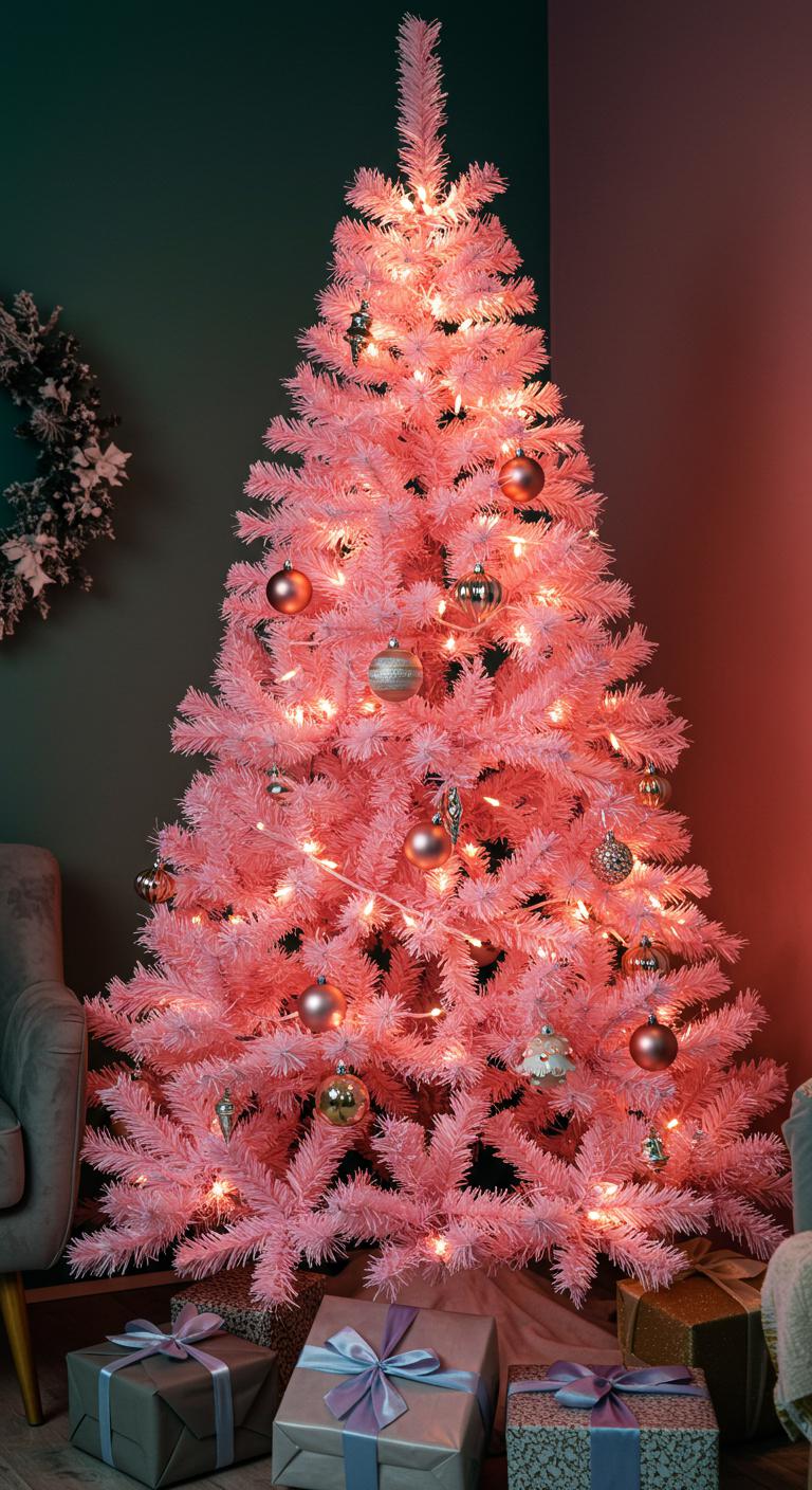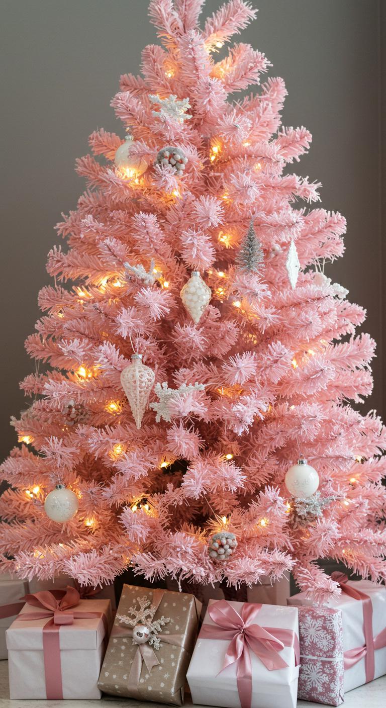 Flocked pink trees add a bit of winter charm to your decor. These trees are covered with a snow-like dusting, reminiscent of a magical wonderland. They pair beautifully with white or silver ornaments for a soft look. If you’re crafty, you can even DIY by spraying artificial snow on a pink tree. For a warm atmosphere, decorate with twinkling fairy lights that offer a cozy glow. The result is truly enchanting, creating a dreamy holiday setting.