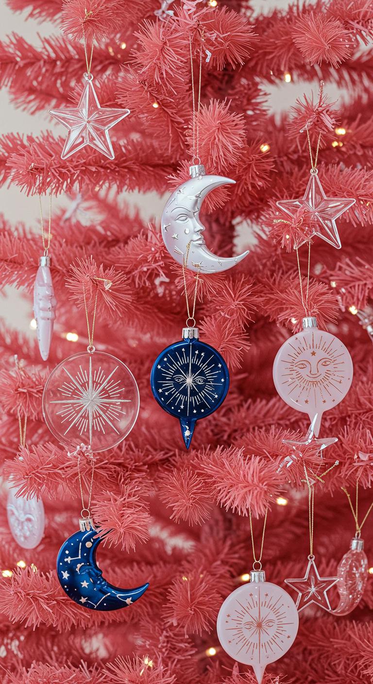 Celestial ornaments add a magical touch to your pink tree. Stars, moons, and planets come alive against the vibrant backdrop. You can buy pre-made ornaments or make your own using playful craft supplies. Simple shapes cut from cardstock painted in metallic colors work beautifully. String them up with twine for an ethereal look. These decorations create an enchanting atmosphere and inspire dreams of holiday magic.