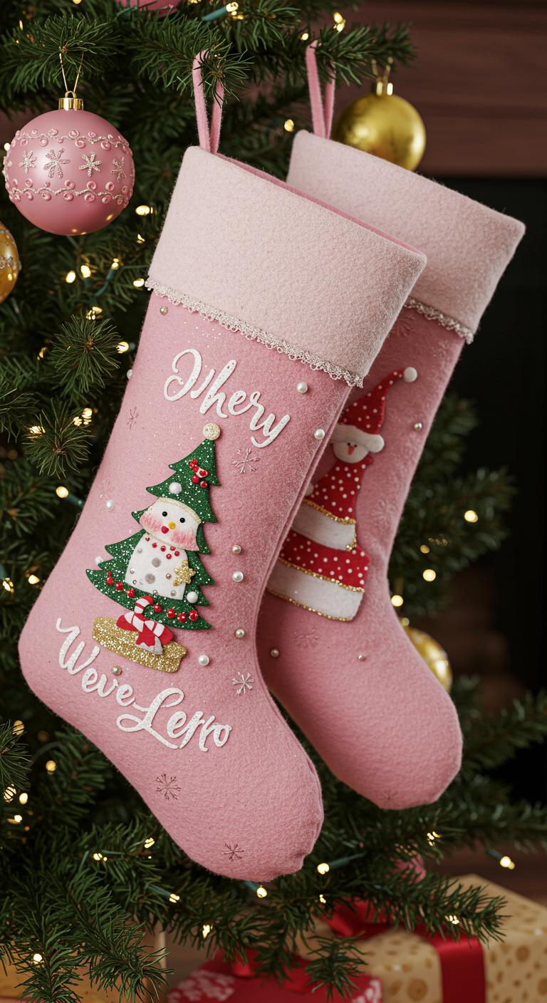 Pink Christmas stockings add a cozy touch to your holiday decor. Hang them near your tree to create a festive display. Investigate local craft fairs or online shops for unique, handmade versions. You can also create your own using fabric scraps, felt, or even upcycled materials. Embellish them with glitter or fun appliqués to match your tree’s theme. These stockings not only hold gifts but also add to the overall Christmas atmosphere.
