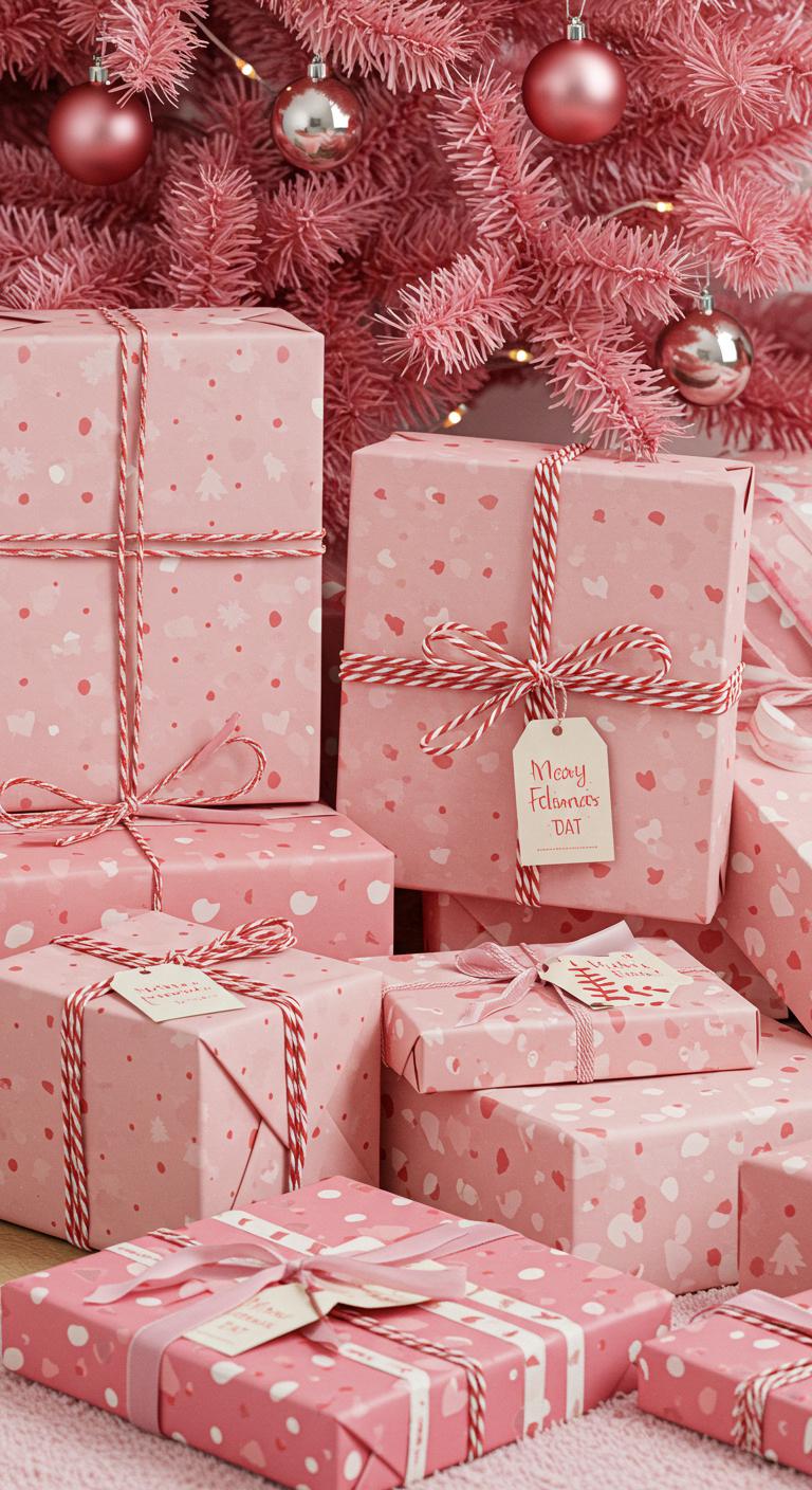 Don’t forget about the gift wrapping! Use pink and gold wrapping paper to tie your festive look together. Add chunky ribbon or fun bows for a stylish finish. For a budget-friendly option, use brown kraft paper and add hand-painted designs or stickers. Personalize each gift with custom tags or handwritten notes for a special touch. This small detail enhances the overall decor while spreading joy to your loved ones.