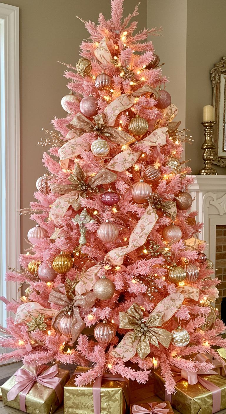 Combining pink with gold elevates your tree to new heights. The warmth of gold complements the vibrancy of pink beautifully. Use gold baubles, tinsel, and garlands that catch the light. For a cost-effective approach, spray paint existing ornaments in gold or DIY glittered projects. Layering pink with gold in different shades creates a cohesive and glamorous look. This stunning combo will impress your guests and project elegance throughout the holiday season.