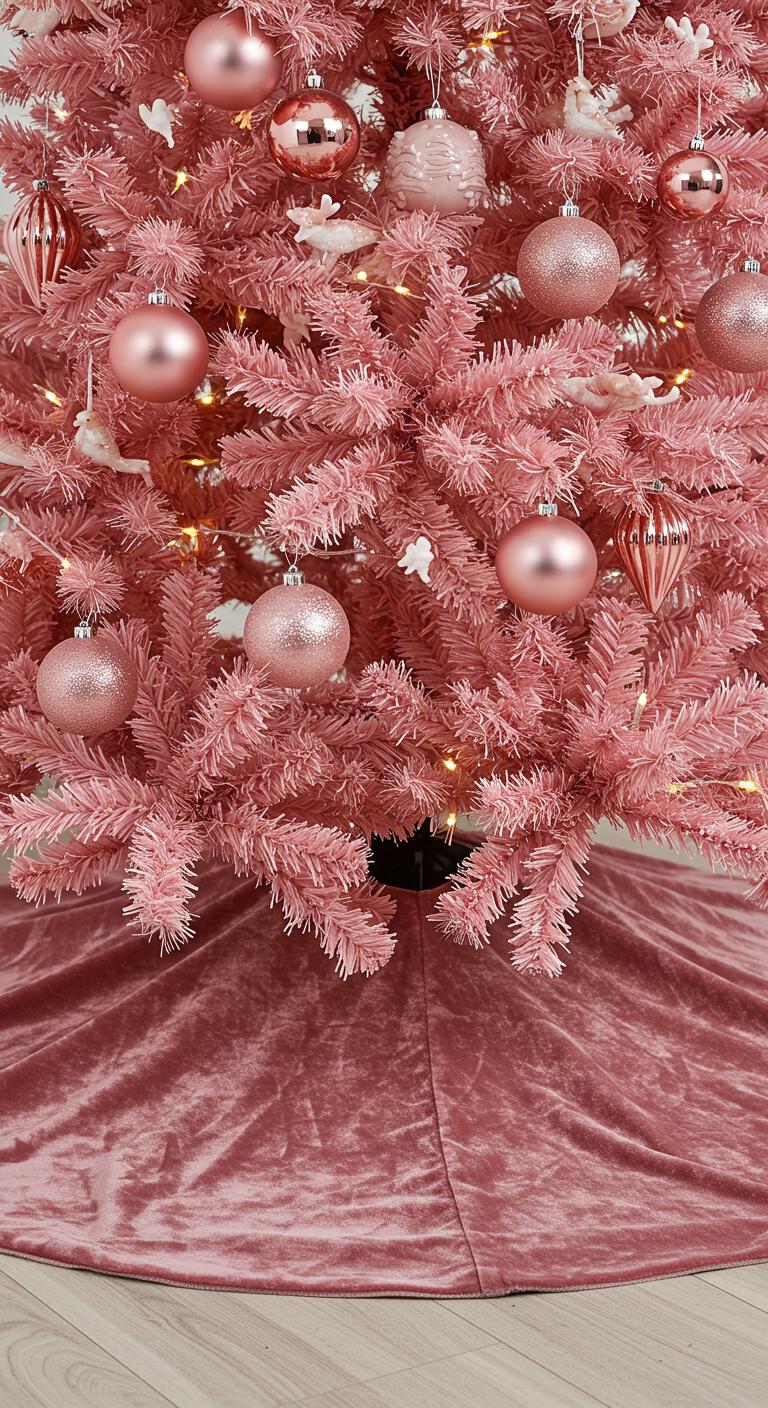 A pink velvet tree skirt amps up the cozy factor and provides a luxurious touch. The smooth texture falls beautifully, enhancing the tree’s elegance. You don’t need to spend a fortune; check local shops for affordable versions. For a DIY option, you can easily sew one out of plush fabric or upcycle an old blanket. Not only does this add style, but it also keeps wrapped gifts from getting lost under the branches.