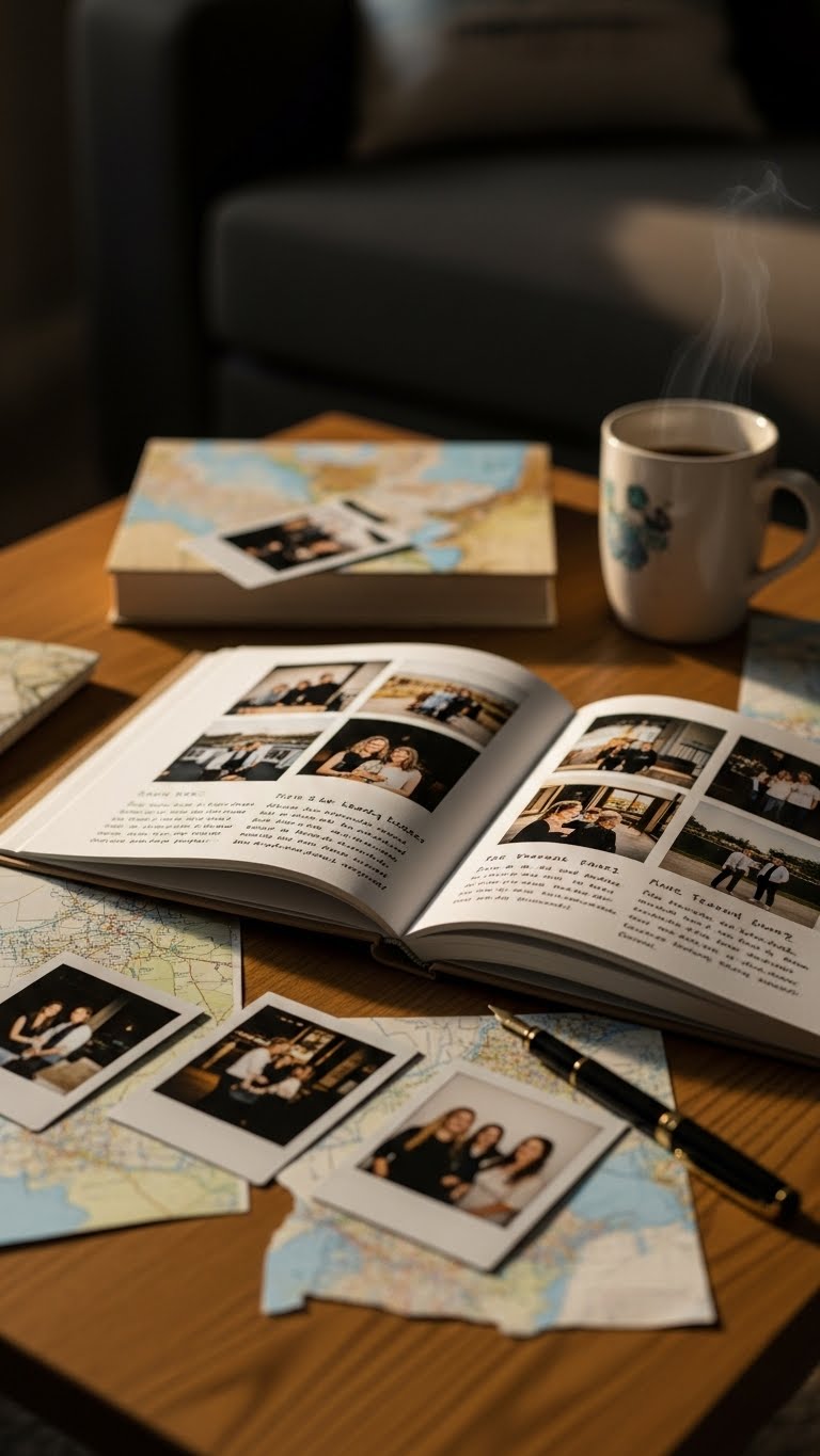 You’ll arrange a polaroid timeline, mix candid shots and travel maps, and add handwritten captions that reveal inside jokes and plans.