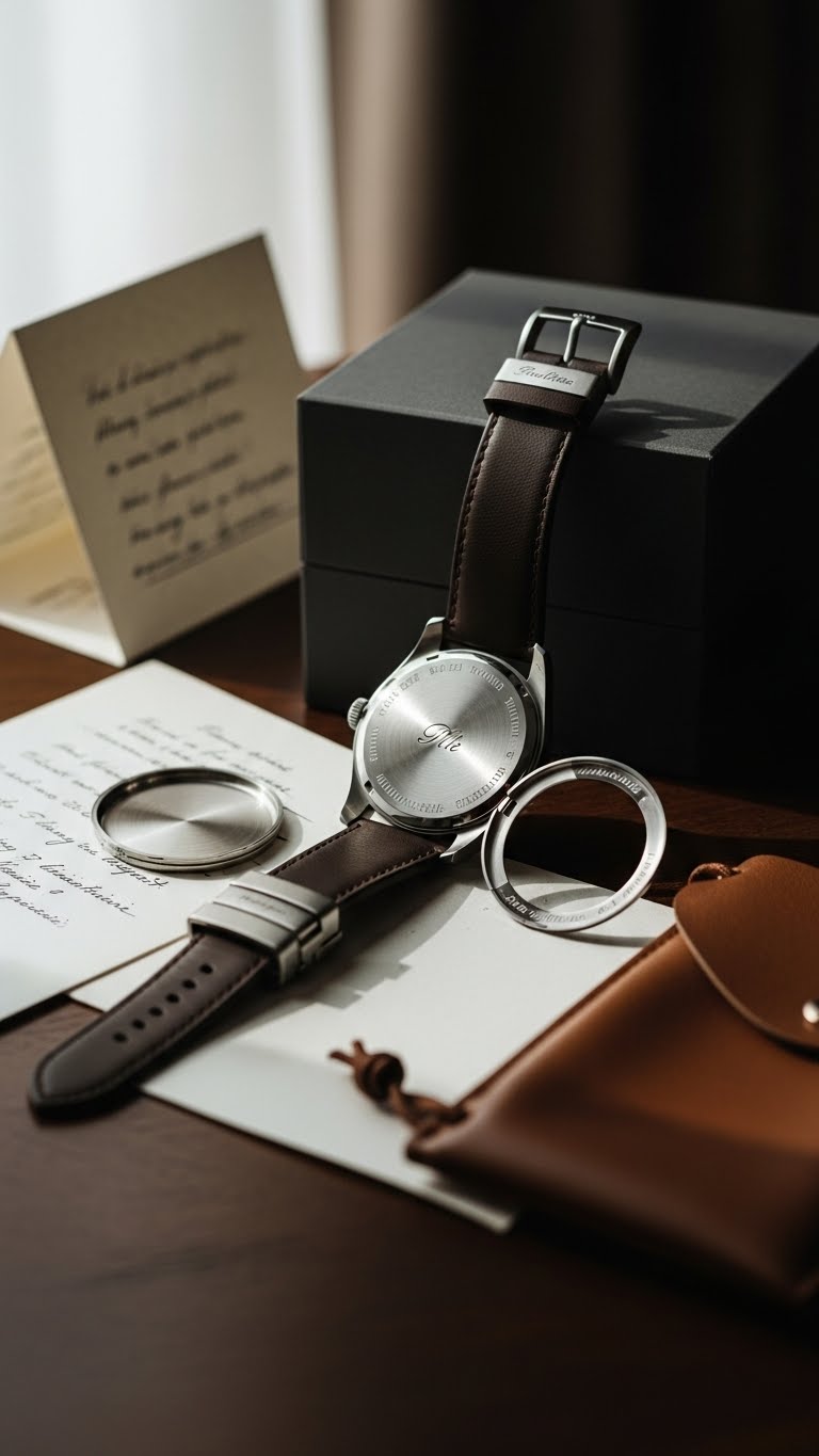 You pick engraving placement—case back or inner clasp—then choose a concise sentimental message that fits.