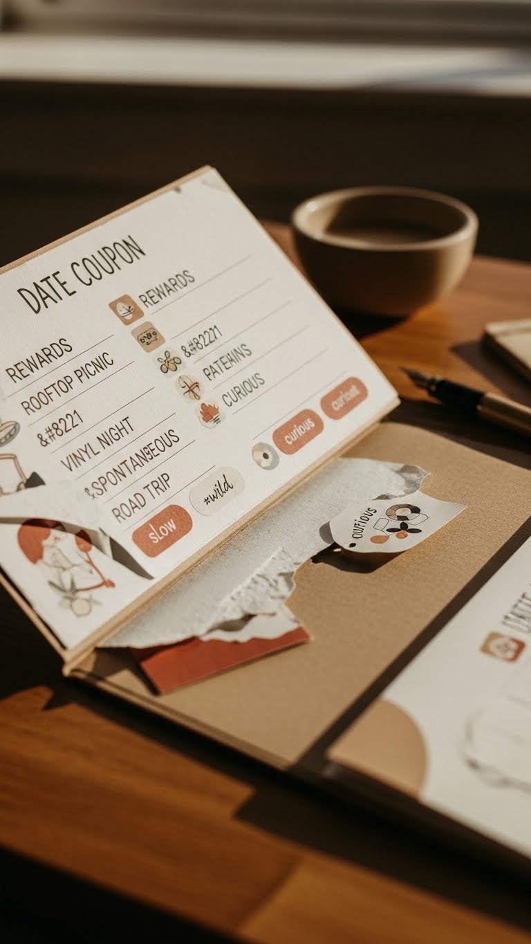 Make a little booklet of promises he can cash in on nights when you both need a break from routine. You’ll craft surprise datecards, each with a small reward—rooftop picnic, vinyl-night, or spontaneous road trip—and add themed activityideas for moods: slow, wild, curious. Keep designs minimal, handwriting honest, and tuck the booklet somewhere he’ll find when he craves freedom and connection.